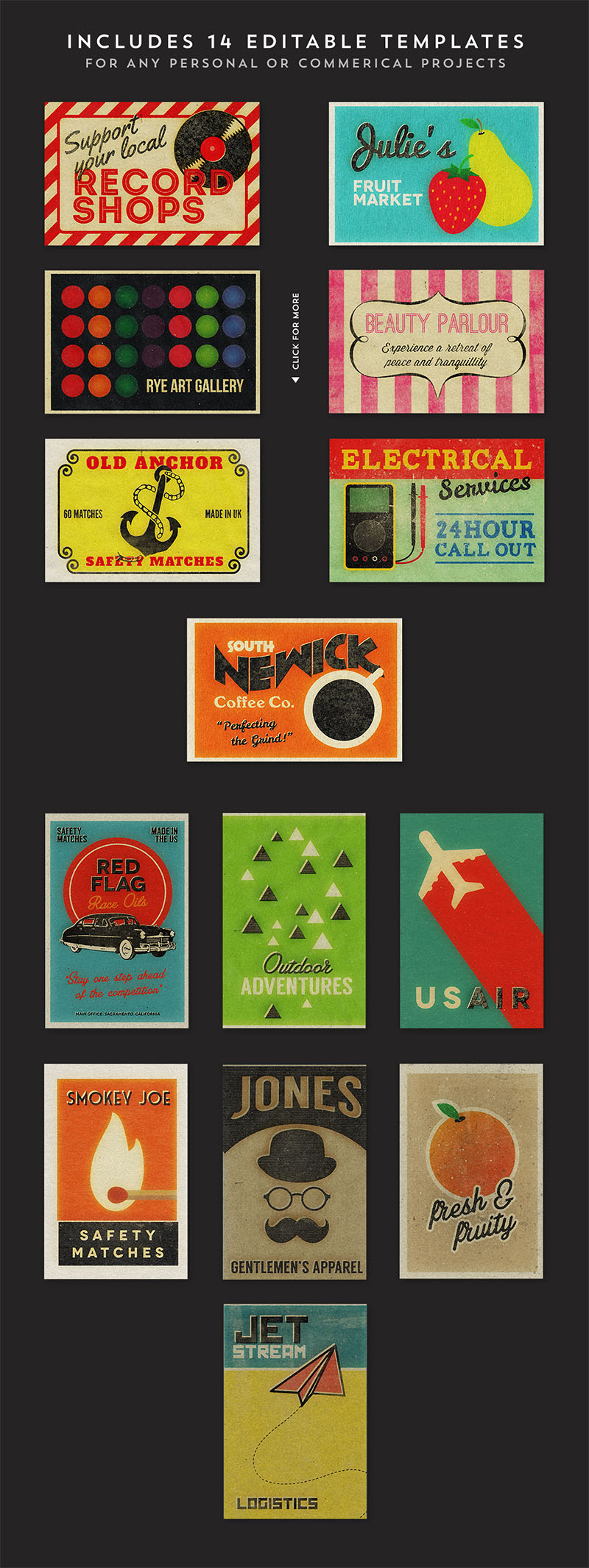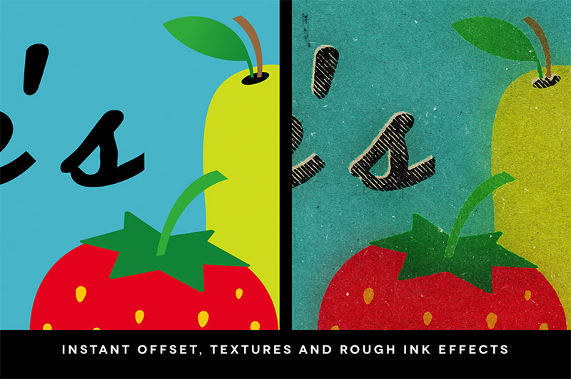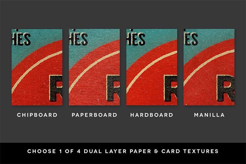 From the 1920s to the 1950s, a small but useful advertising gimmick spread like wildfire into the purses, pockets, and kitchen drawers of millions of Americans. The give-away matchbook was one of the most pervasive means ever found of putting promotional images into the hands of the public. Super Strike recreates those wonderful works of art instantly. It takes your flat, dull illustration and adds unique and realistic textures, filters and even offsets the black from the colors, for realistic miss-registration effects. This is done automatically all inside the SuperStrike PSD. No splitting your artwork into different smart object layers. Just one place to paste your work and it’s done. Video demo: http://vimeo.com/114544650