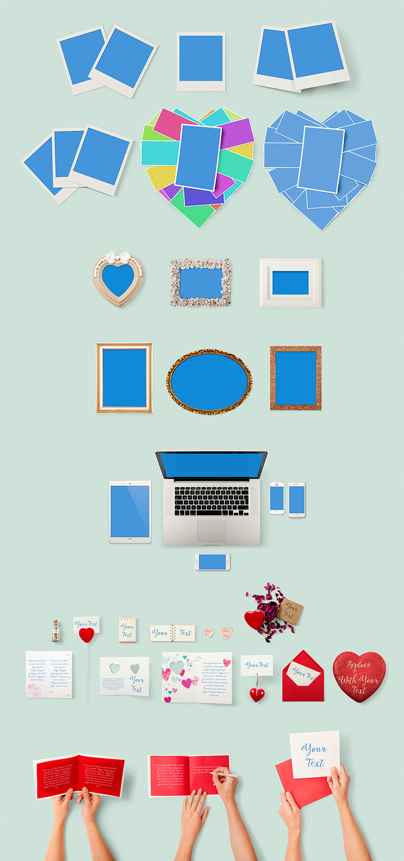 Hello. We’re loving to create unique and high quality items. Also loving you all 🙂 To show our love to you we’ve prepared a great file for you. In Love Assets And Mock Ups Pack ! As always ultra high quality objects and photos, you will able to drag and drop into any canvas them. You can show your works in a lovely style, or you can create amazing contents in valentine’s day concept. Also this file suitable with our other drag and drop items. We’ve included polaroid photo, Macbook, iPhone, iPad and greeting card mock ups. You can easily replace your image or text into them. After replacing your content you can create limitless variations with just drag and drop again.