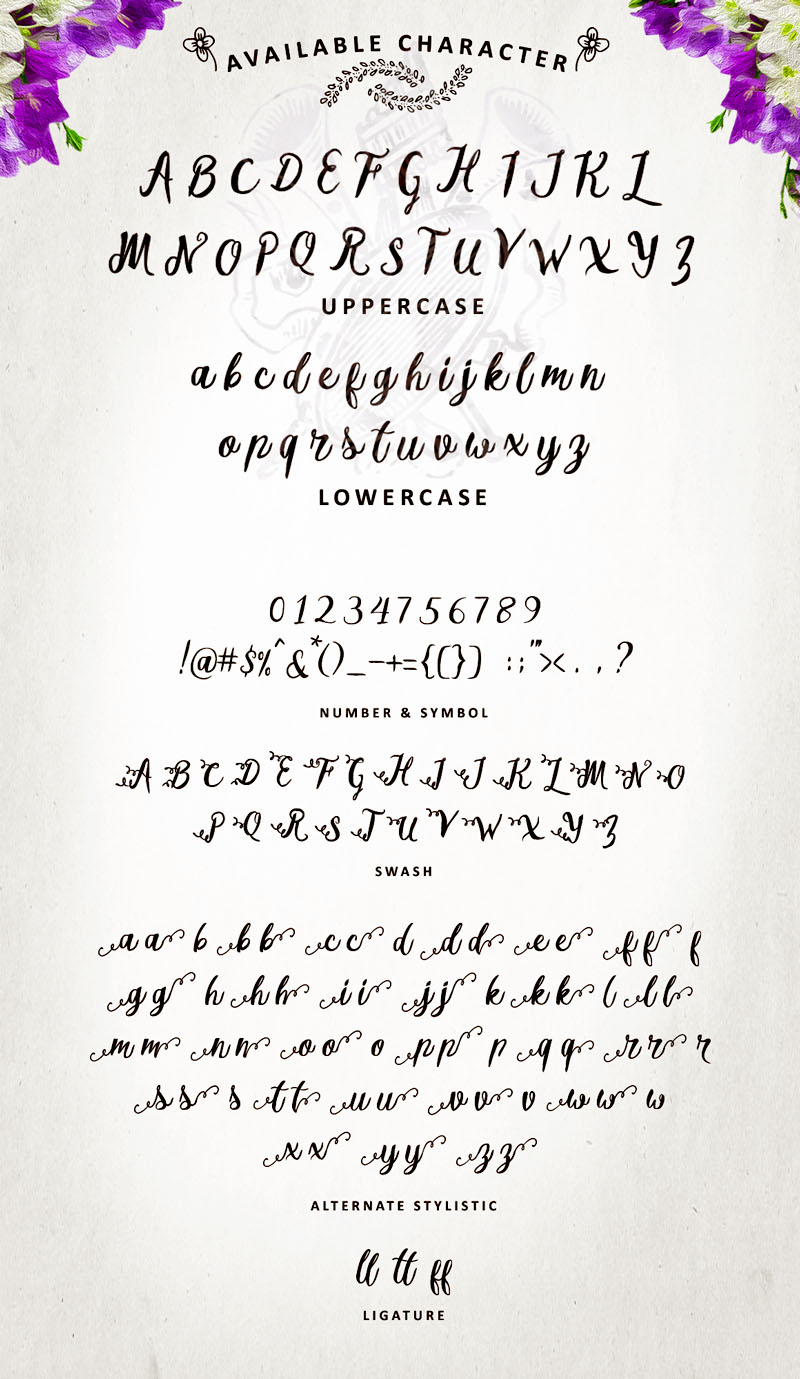 Melliana Script is a handmade script typeface. Melliana Script is suitable for wedding invitation, any greeting cards, retro / vintage design style, or any design that needs natural and personal touch. Mix and match the alternate characters to add an attractive message to your design. 290 glyphs and alternate character contain with opentype features. Stylistic alternates, Ornament, Swash and more.You can access all those alternate characters by using OpenType savvy programs such as Adobe Illustrator and Adobe InDesign.