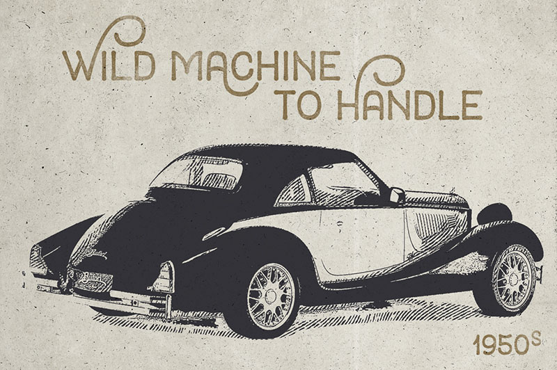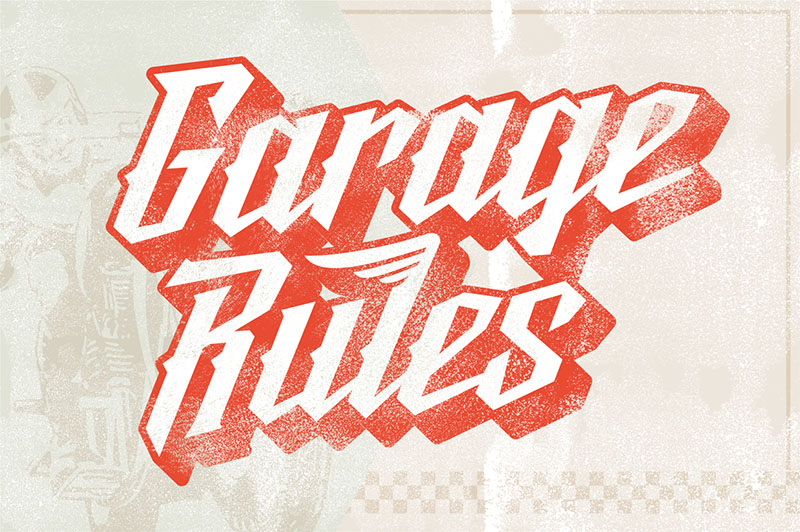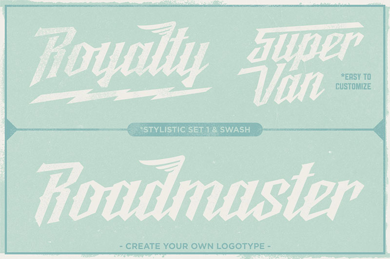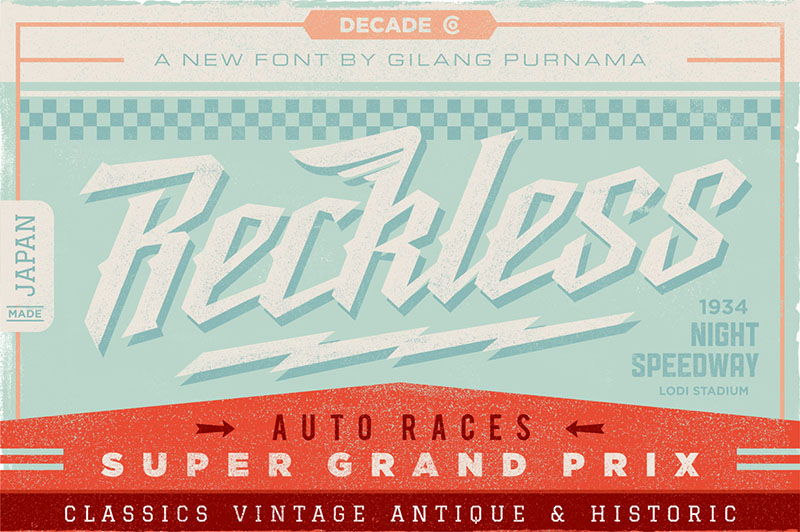 Reckless is hybrid connected geometric typeface between script, blackletter and tattoo feel, it can be used in logos, games and graphic related to cars, automotive, Detroit, 1940, 1950, 1960, vintage, retro, classic and old machines.