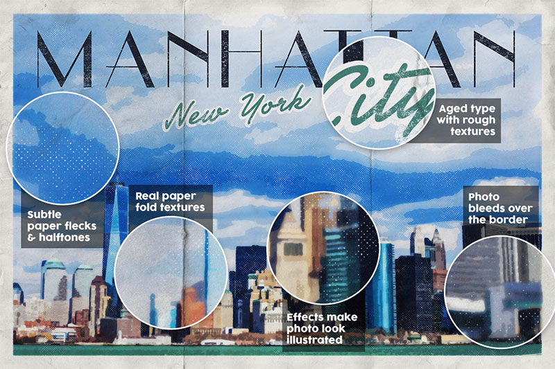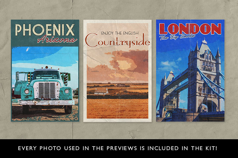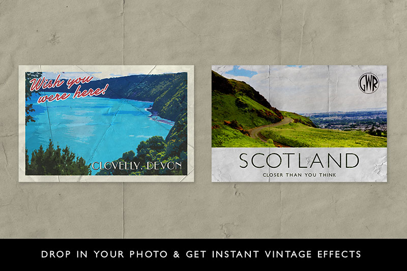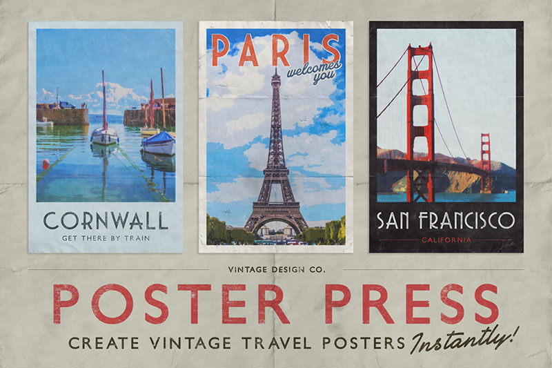 I love vintage travel posters, especially original ones from the early 1900s, with their simplistic illustrations and art deco typefaces. Trying to recreate a poster like that takes longer than you think and many hours in Adobe Illustrator. Now you can do that quickly and easily with PosterPress. PosterPress smart PSD (Layered Photoshop Document) is set up so you all you have to do is drop in your photo and it instantly turns it into a simplified illustration which blends over the border, has subtle paper flecks, halftones and paper folds which adds age and a folder with editable text with it’s own rough texture. I have teamed up with travel photographer Adam Barlow to bring 12 photos from around the globe to use in your very own posters. Plus I’ve complied a 3 page list of vintage art deco typefaces, available free and with previews and links to download them. Video demo: http://vimeo.com/108351991