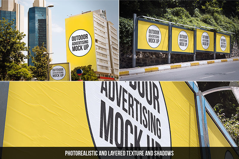12 city outdoor mock up for advertising designs. You can find any format of city advertising. Billboard, city light poster, mega light, wall etc. areas to replace your own designs. Also all PSD files fully layered and well organized. You can play with reflections, shadows and overlay textures. If you want to present your outdoor advertising designs in a professional way, you will love this mock up pack.
