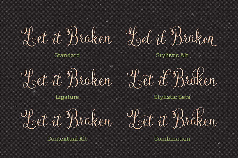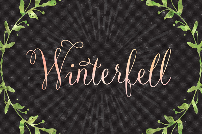 Winterfell is a dancing script font that proportionally presents natural feel to create a personal message with calligraphy style. You can use Winterfell in wedding invitation, greeting cards, valentine day, etc. Winterfell consist of 331 glyphs in total and 159 alternative characters to play with. Mix and match the alternative characters to create an attractive message or a hand-made content. The alternative characters in Winterfell font were divided into several OpenType features such as Contextual Alternates, Stylistic Alternates, Stylistic Sets, and Ligature. The OpenType features can be accessed by using OpenType savvy program such as Adobe Illustrator and Adobe InDesign.