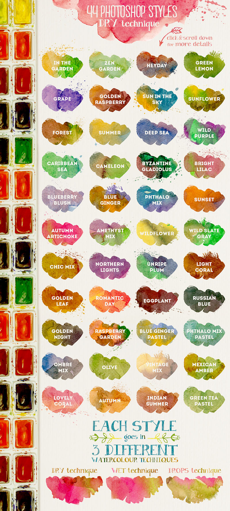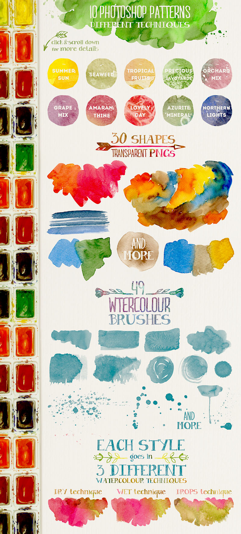 For some time now watercolour have been trending in blog designs, prints, packaging and branding designs. If you’re looking into designing or redesigning your ideas, watercolour trend is still blowing up and here are some hand-painted resources to get started. 44 Photoshop Styles. Each Style is created in 3 watercolour techniques. As they are hand painted most of them have many washes different from each other. I kept the same colour palette for each set of 3 Styles, thanks to the combination of the blended colours resulted colour may be slightly different but you will find them under the same name. Basically the pack contains 132 watercolour Styles in 3 .ASL files. 10 Watercolour patterns (.PAT File). 49 Watercolour stamp brushes (.ABR file). 30 Watercolour lose shapes (Transparent .PNGs), shapes dimension varies from 6000 to 500px. Bonus: 2 Watercolour blank papers (6800x3826px)