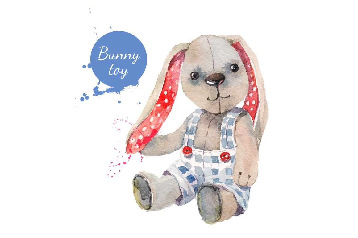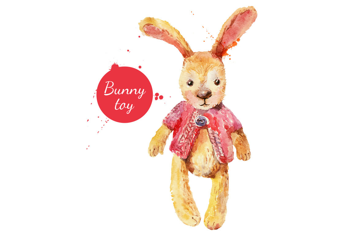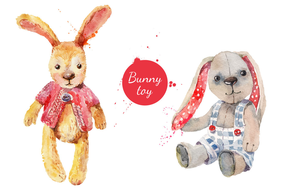 Set of hand drawn watercolor bunny toys. Traced vector illustrations. Zip file contains 2 editable EPS 10 vector files and 2 high resolution JPEG images.