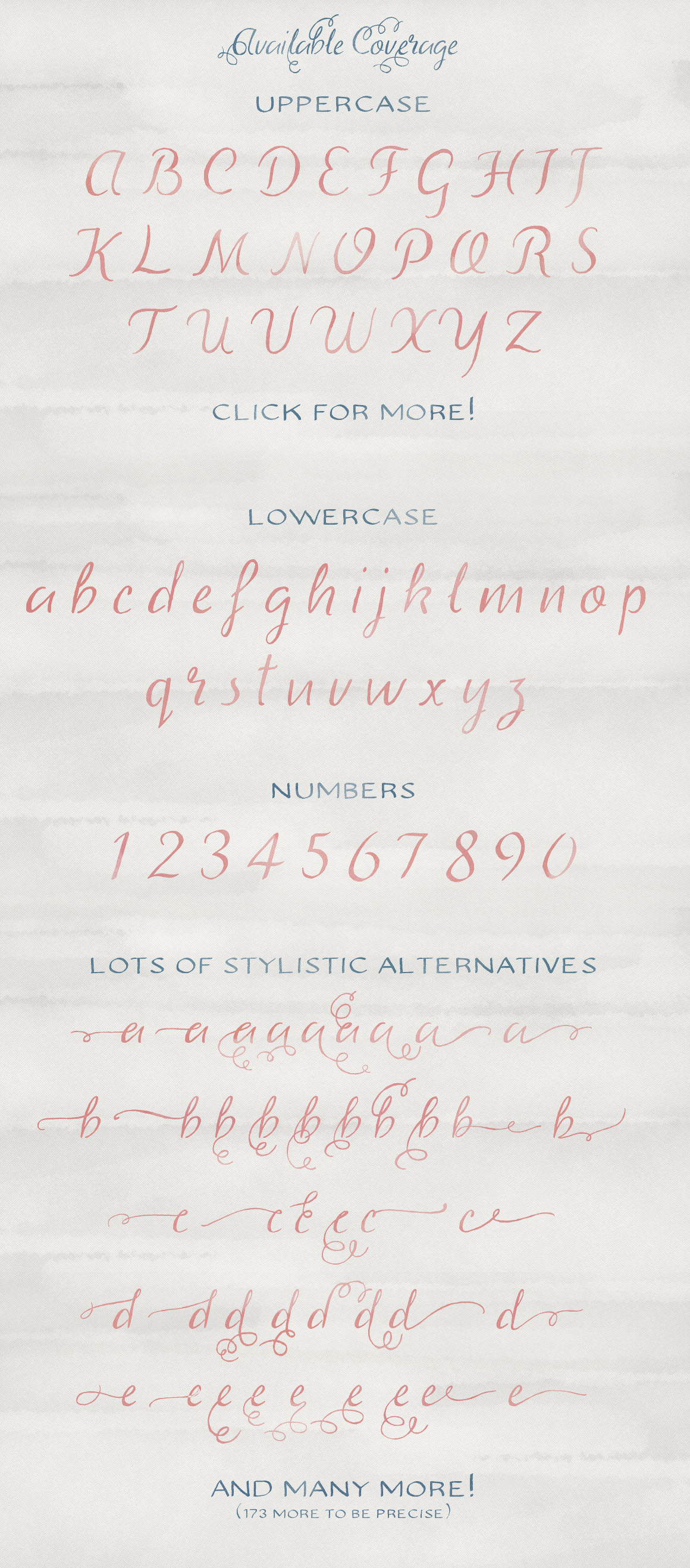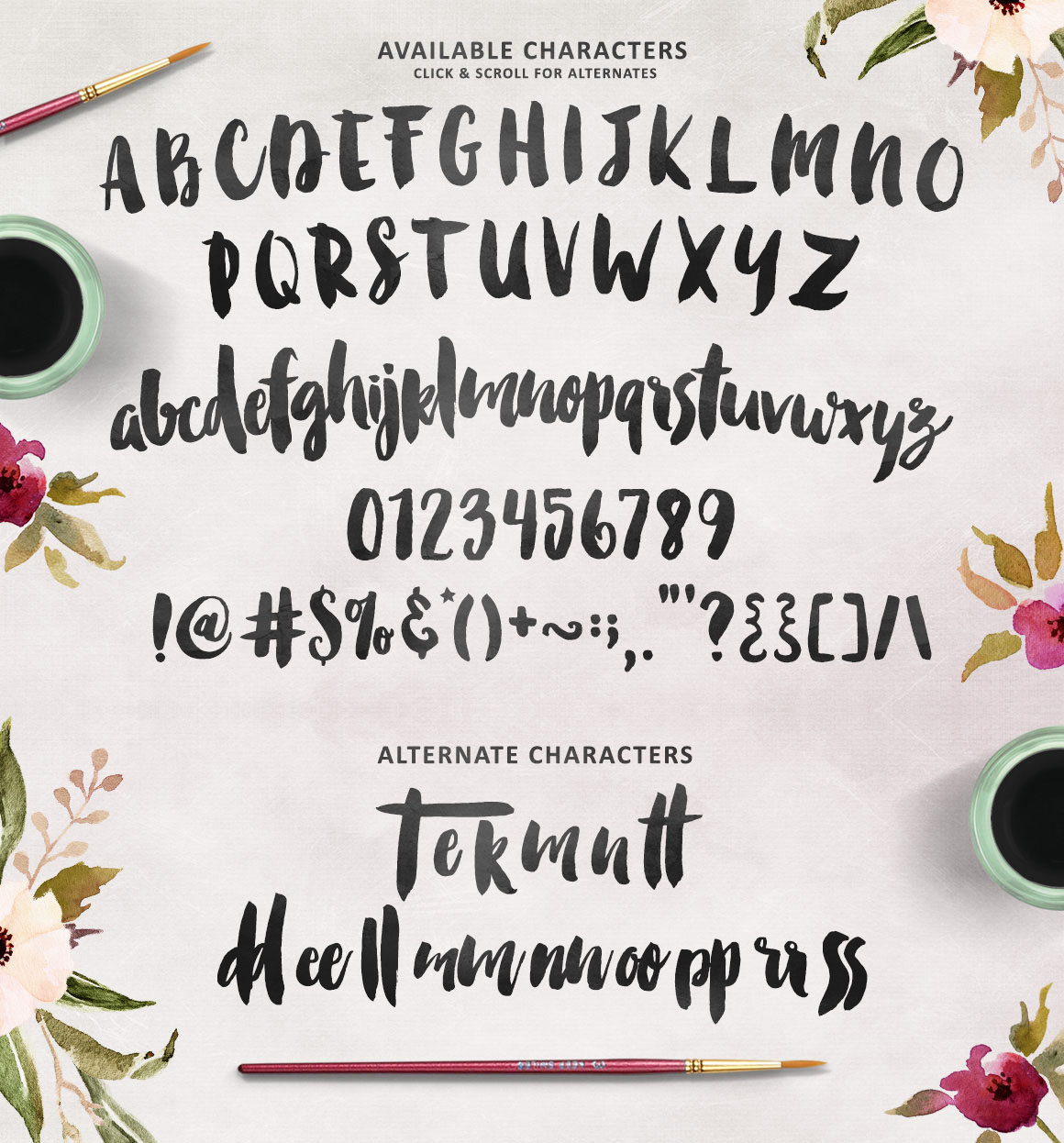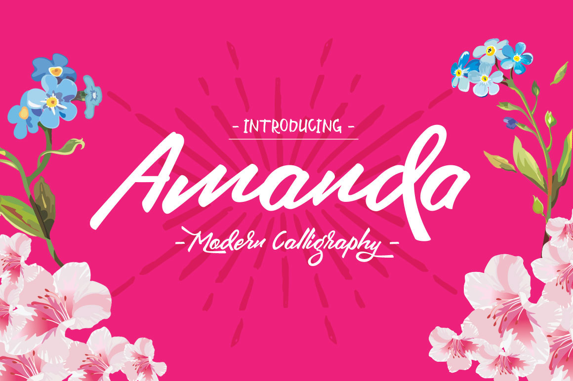 Amanda is a beautiful Modern Calligraphy handwriting script. Suitable for wedding invitations, greeting cards, design of water-based paints, correspondence, and a variety of other purposes. With 320 glyphs and 121 alternatives characters, you can mix and match Amanda to fit your design. The alternative characters divided into several OpenType features such as Ligature, Contextual alternates, stylistic alternates, stylistic sets, and swash. It can be accessed by using OpenType savvy program such as Adobe Illustrator and Adobe InDesign.