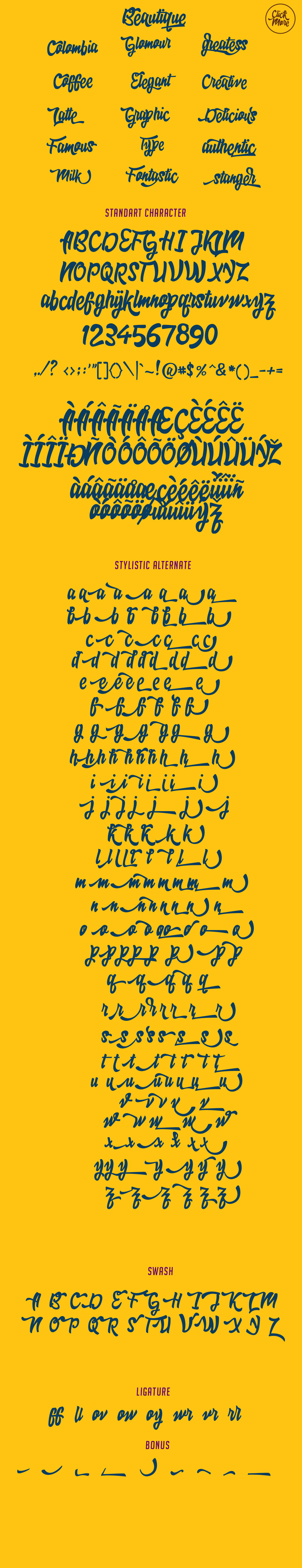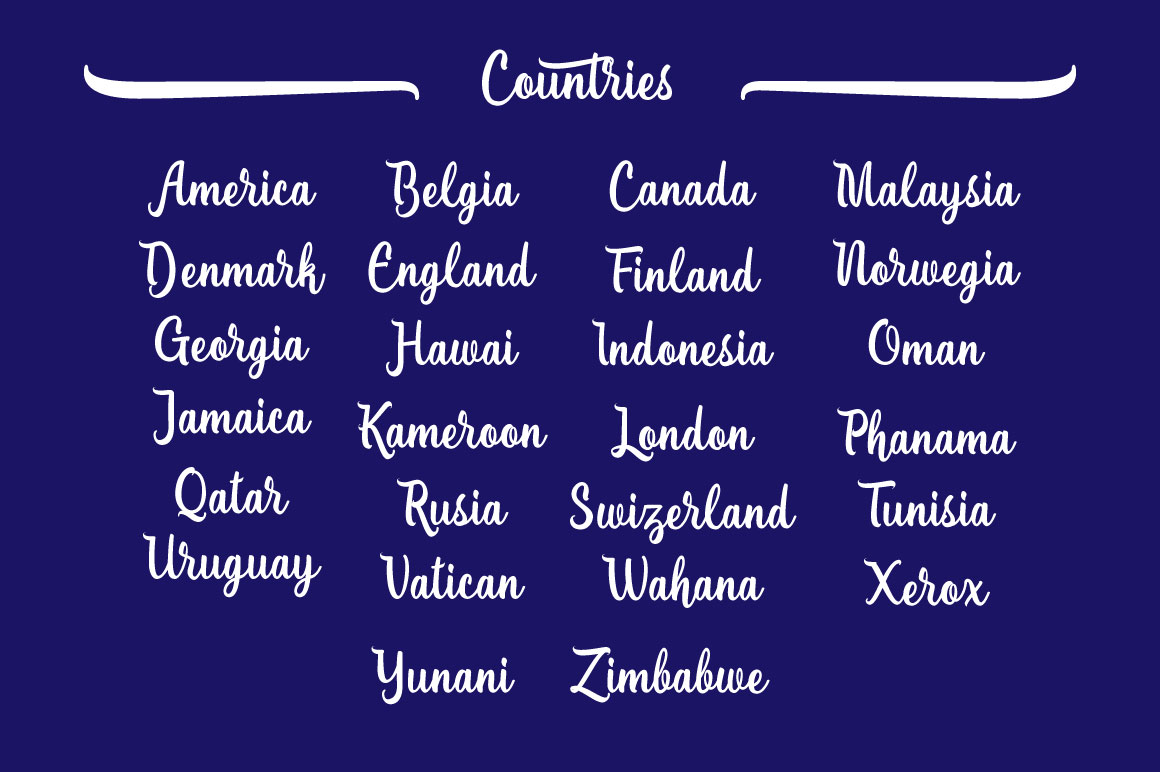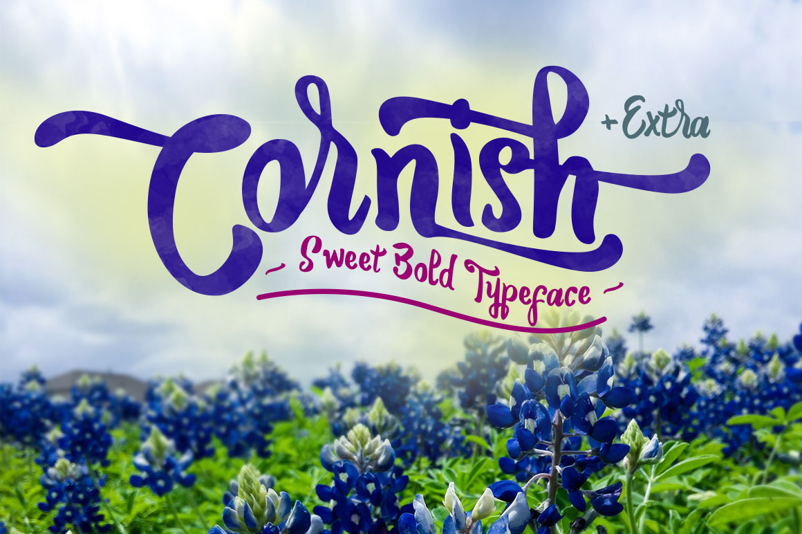 Cornish is a Sweet Bold Typeface. It was designed as a display typeface that contains 300 glyphs in total and 131 alternative characters to improve your design. You can use it as a logo, badge, insignia, packaging, headline, poster, t-shirt/apparel, greeting card, and wedding invitation. The flowing characters are ideal to make an attractive messages, mix and match Cornish with a bunch of alternative characters to fit your project. The alternative characters in this font were divided into several OpenType features such as Swash, Stylistic Sets, and Ligature. The OpenType features can be accessed by using OpenType savvy program such as Adobe Illustrator and Adobe InDesign.