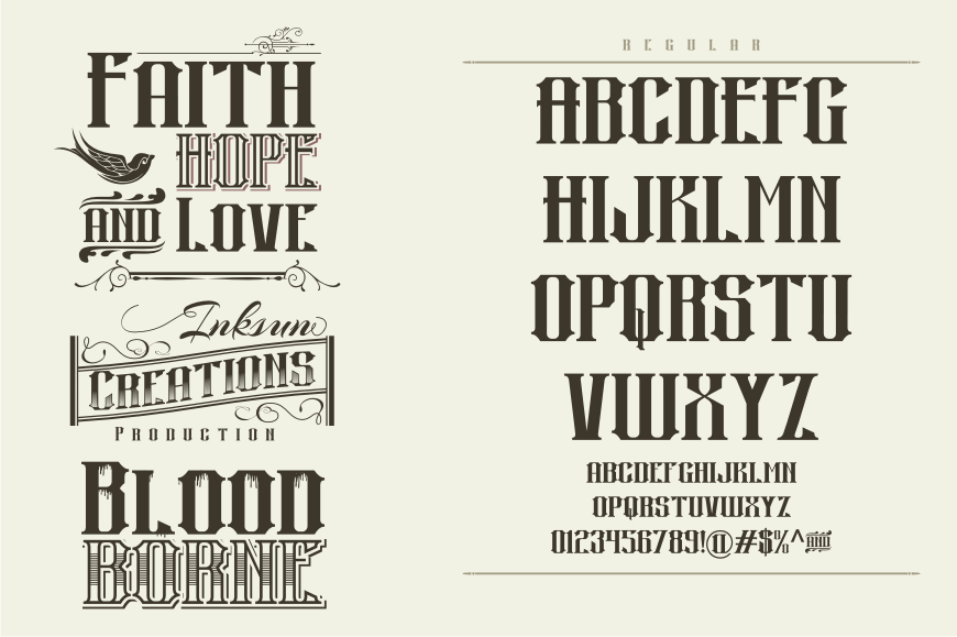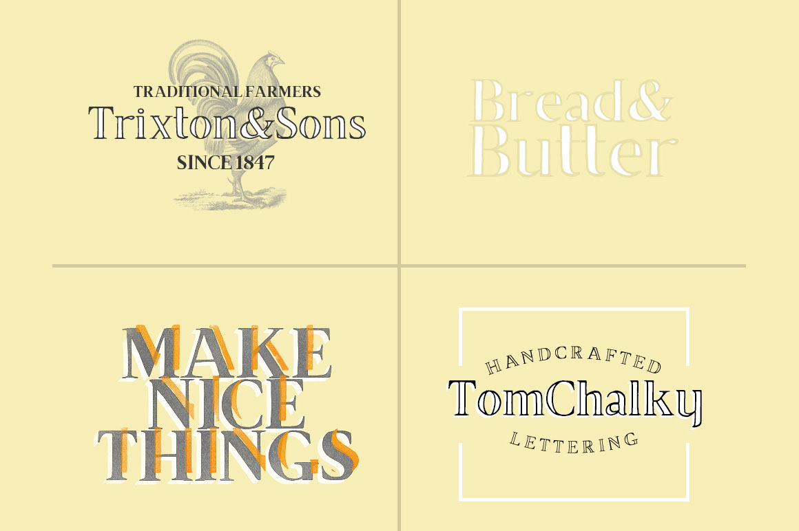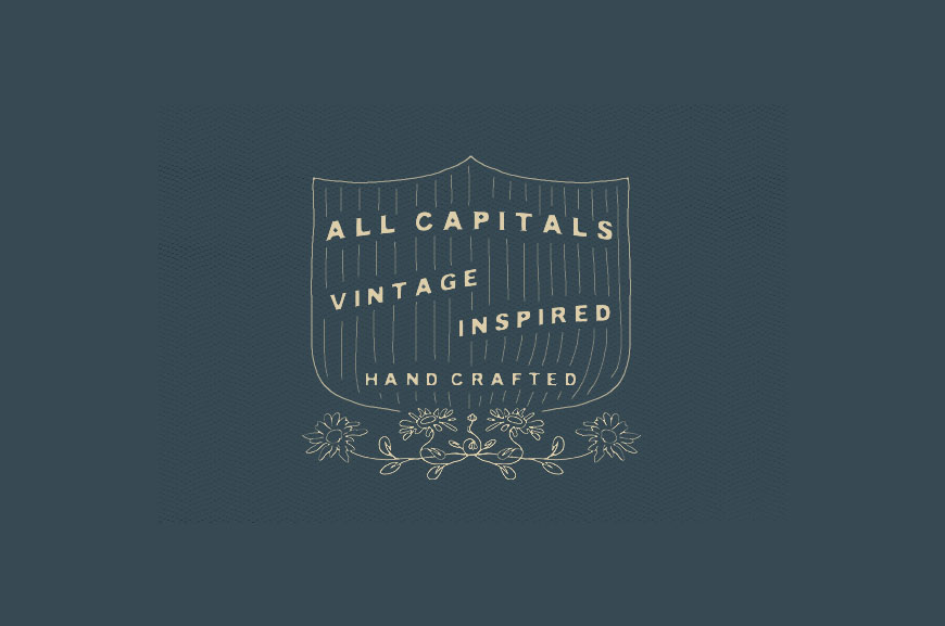 The all capitals, vintage inspired Lance font family include both sans and serif alternatives. I have held back from stylizing the font too much, making it a very versatile family suitable for many design solutions such as headings, wedding invitations, t-shirts, letterhead designs, signage, labels, posters, badges etc.