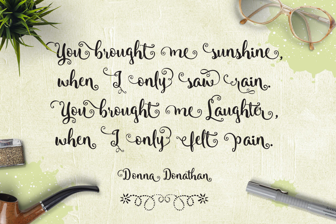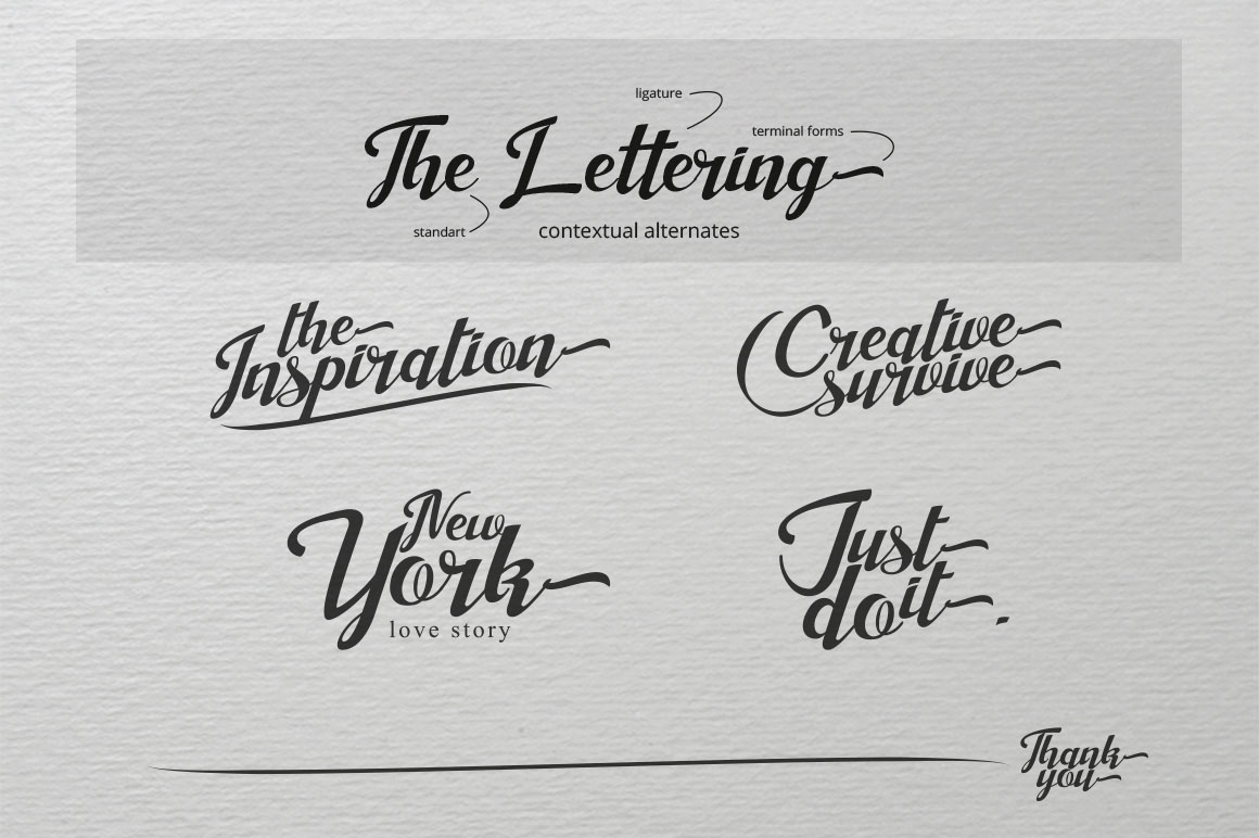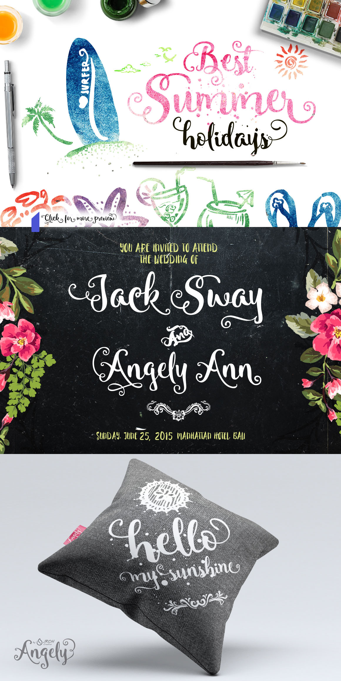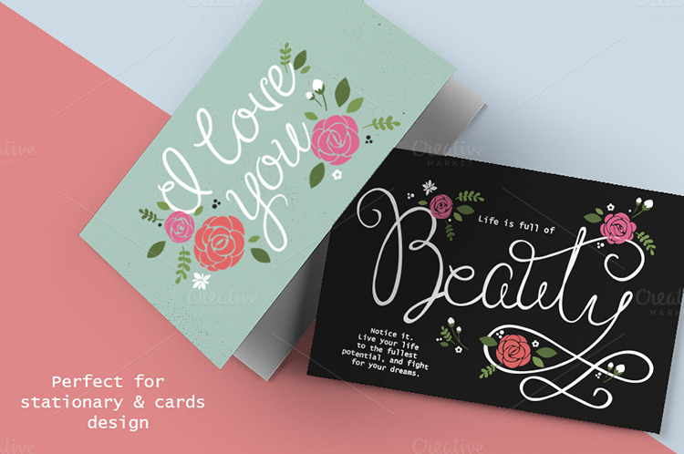 Introducing Angely new lettering typeface with ton of bonus elements. Suitable for your summer holiday project, wedding, poster, quote, invitation or greeting card. Opentype features is: standard ligatures, Contextual alternates, Swash, Stylistic alternates. Complete with 394 glyphs included initial and terminal forms.