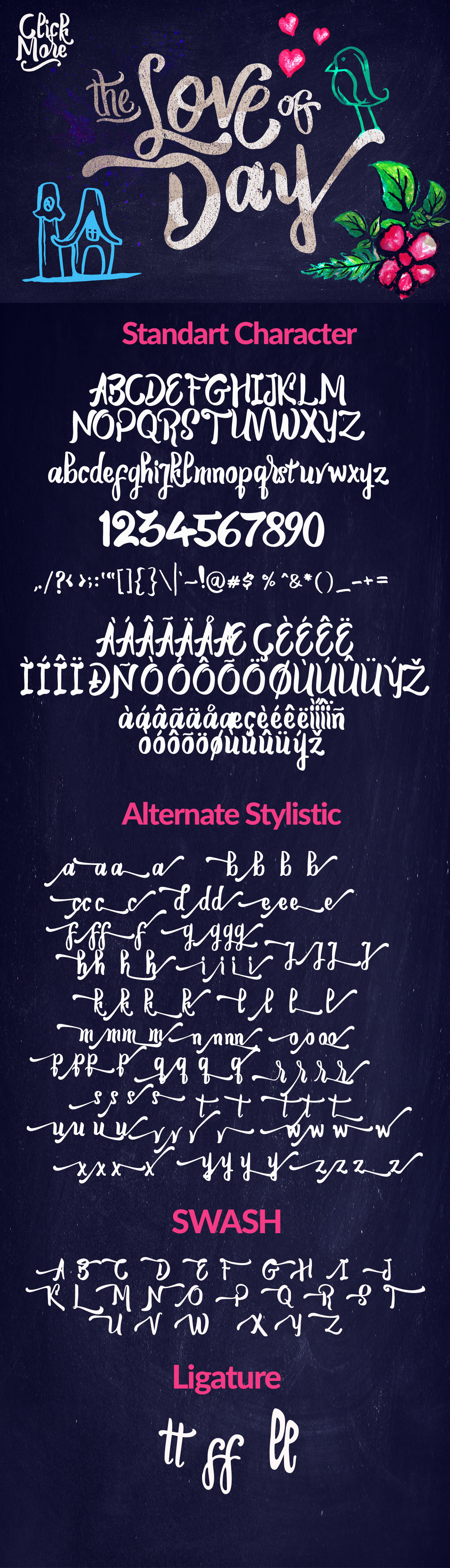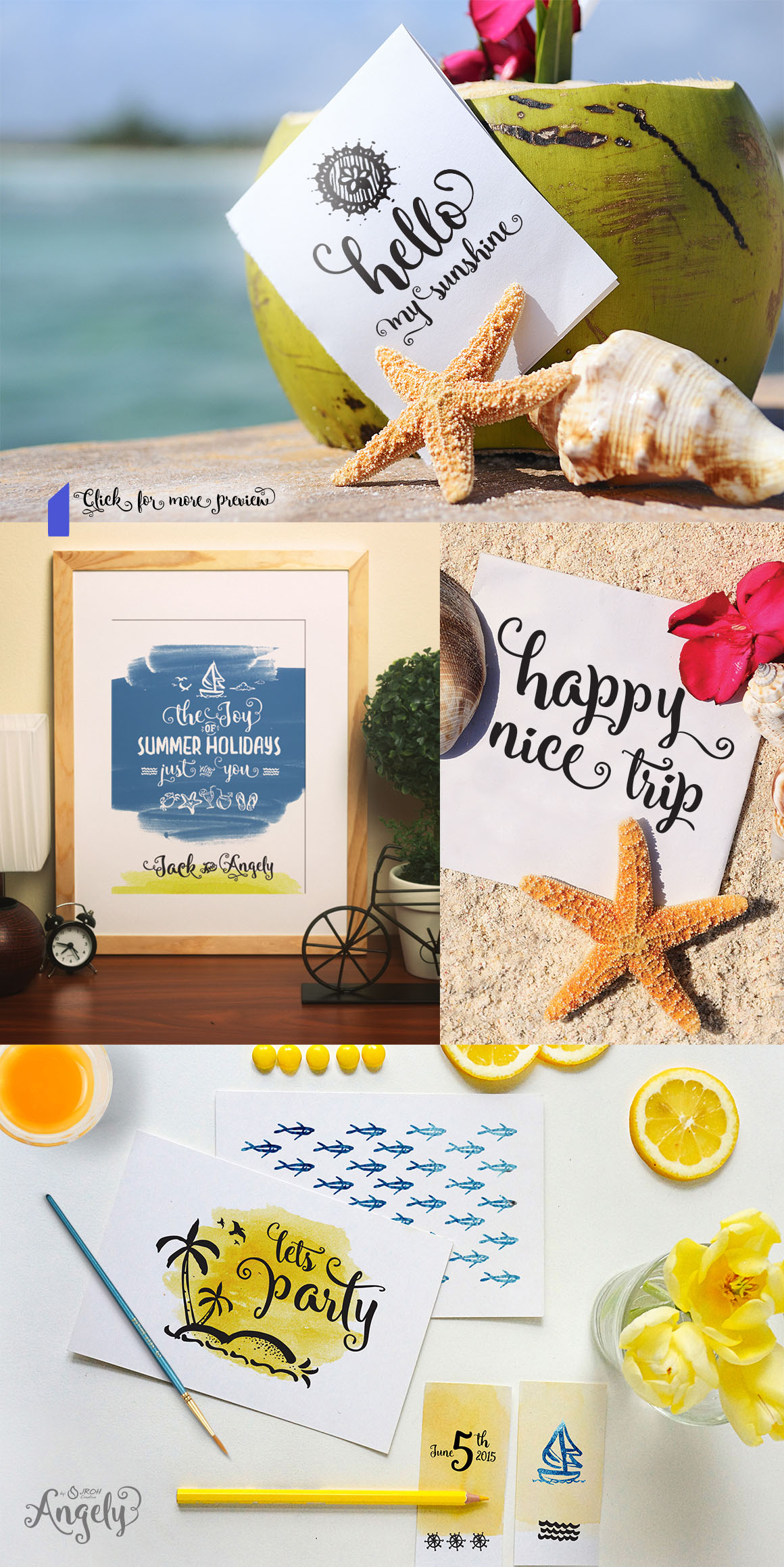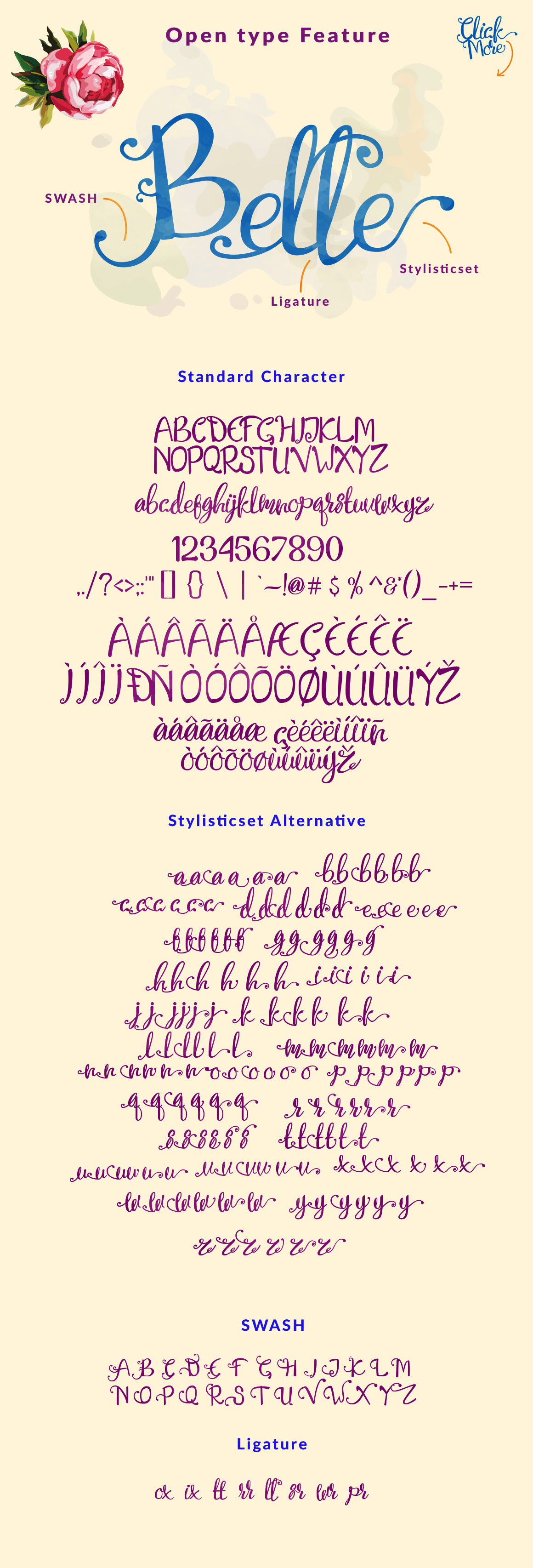 Introducing Angely new lettering typeface with ton of bonus elements. Suitable for your summer holiday project, wedding, poster, quote, invitation or greeting card. Opentype features is: standard ligatures, Contextual alternates, Swash, Stylistic alternates. Complete with 394 glyphs included initial and terminal forms.