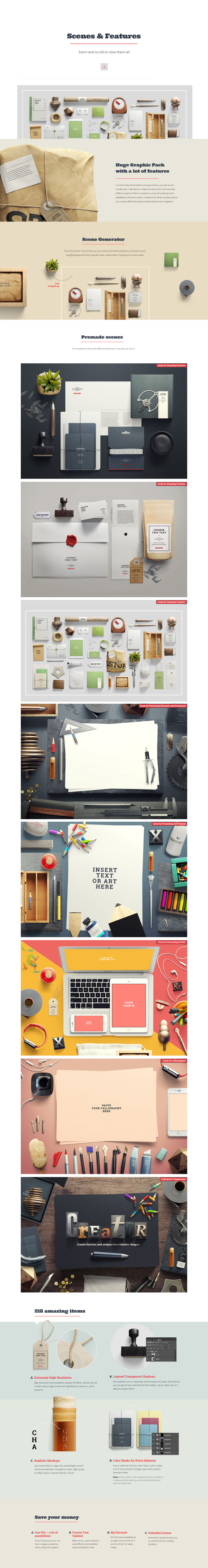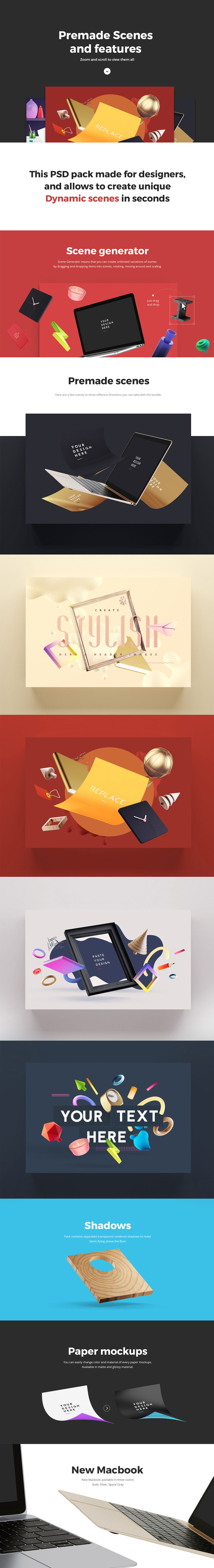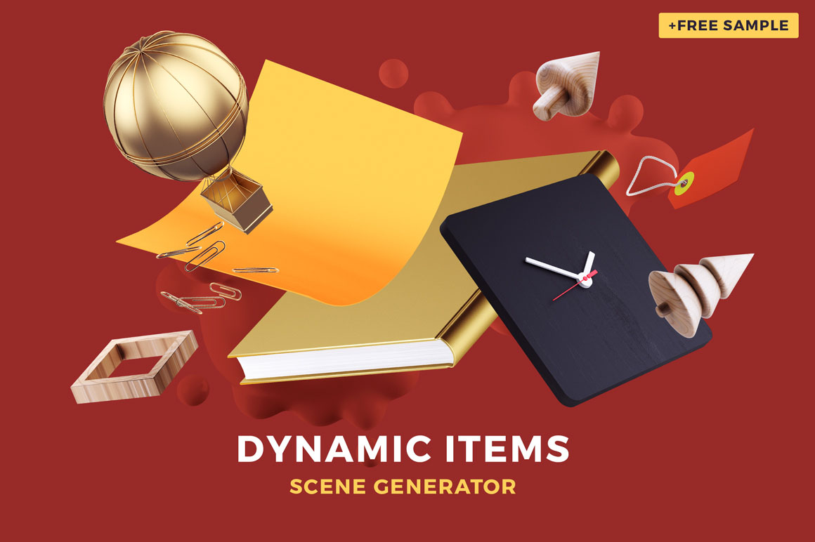 «Dynamic Items Scene Generator» awesome graphic pack. Contains 190+ items inspired by the works of the best industrial designers. All items created in a big resolution and excellent quality, that allows you to create really huge scenes, can be used for Retina big screens and for print projects. Check the resolution of every item on the list of objects before buy. There are a lot of Mockups. Double click at smart object, paste your text (or logo, or design) and text will changed on item. Very handy and easy to use. Every item was modeled, rendered and retouched. All items made in the in the same lightning setup, and rendered with a SuperTele camera for minimum perspective distortion (but it’s not orthogonal). Use it for Websites, Banners, Hero Images, Header Images, Facebook Covers, Presentations, Apps, Book Covers, Flyers, etc. There is no limitation where and how you can use it. 5 Premade scenes included.