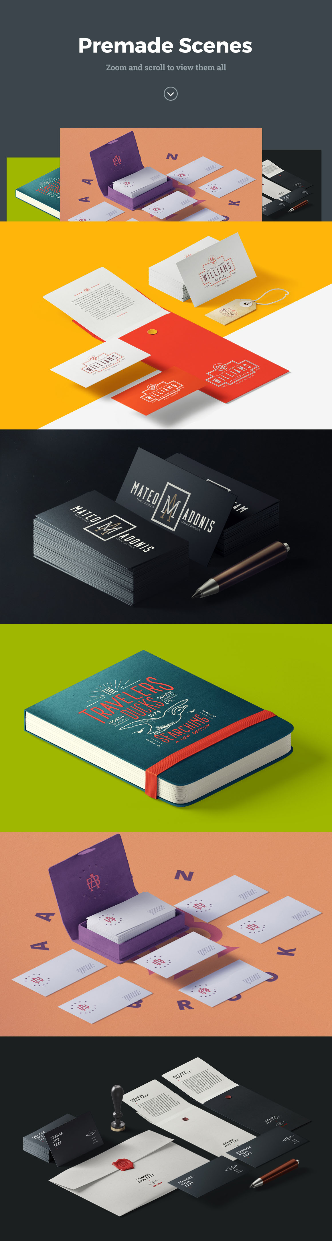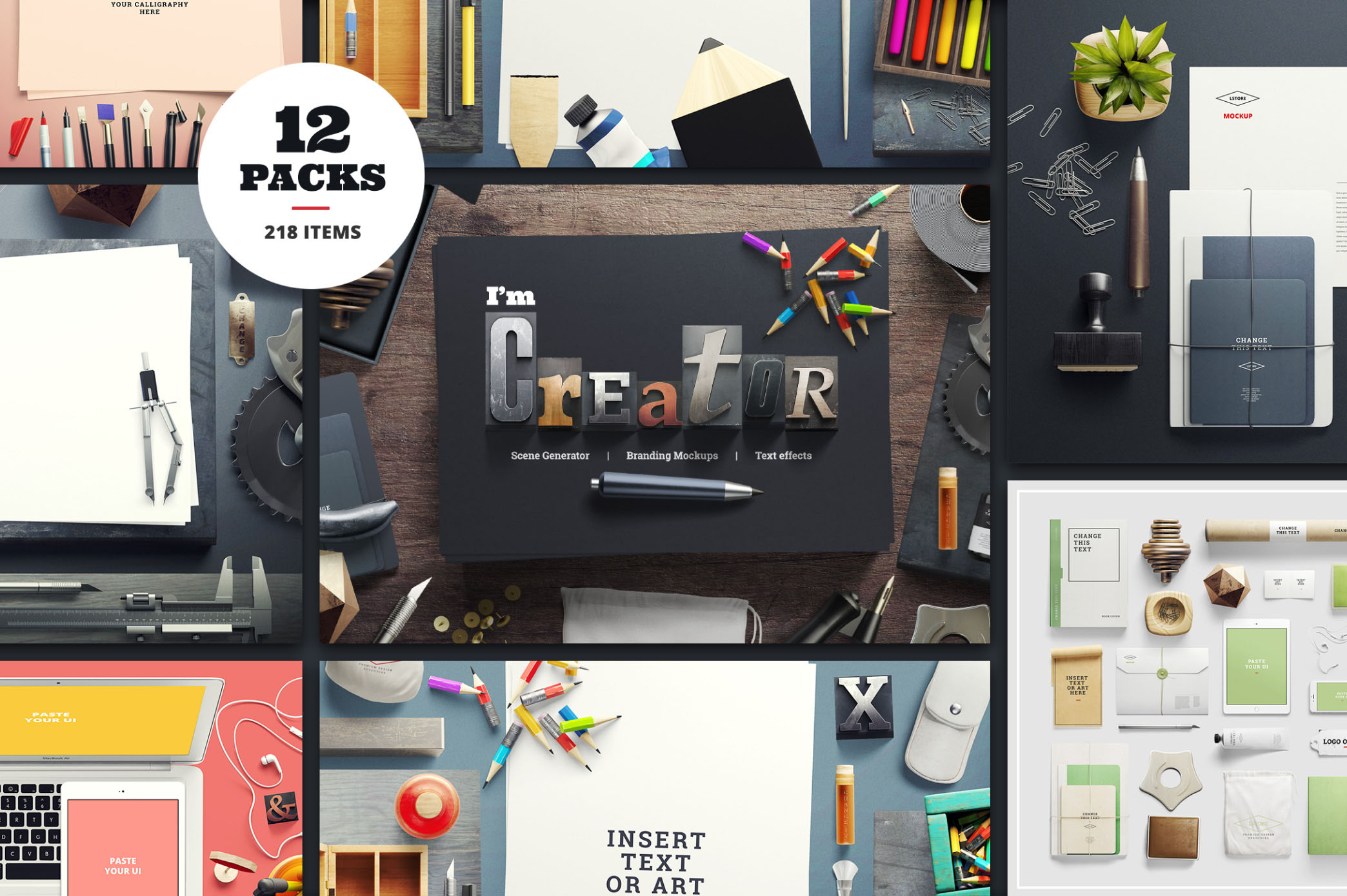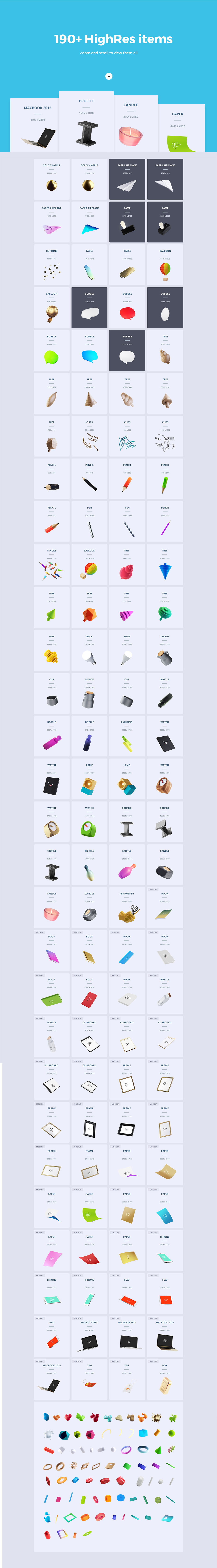 «Dynamic Items Scene Generator» awesome graphic pack. Contains 190+ items inspired by the works of the best industrial designers. All items created in a big resolution and excellent quality, that allows you to create really huge scenes, can be used for Retina big screens and for print projects. Check the resolution of every item on the list of objects before buy. There are a lot of Mockups. Double click at smart object, paste your text (or logo, or design) and text will changed on item. Very handy and easy to use. Every item was modeled, rendered and retouched. All items made in the in the same lightning setup, and rendered with a SuperTele camera for minimum perspective distortion (but it’s not orthogonal). Use it for Websites, Banners, Hero Images, Header Images, Facebook Covers, Presentations, Apps, Book Covers, Flyers, etc. There is no limitation where and how you can use it. 5 Premade scenes included.