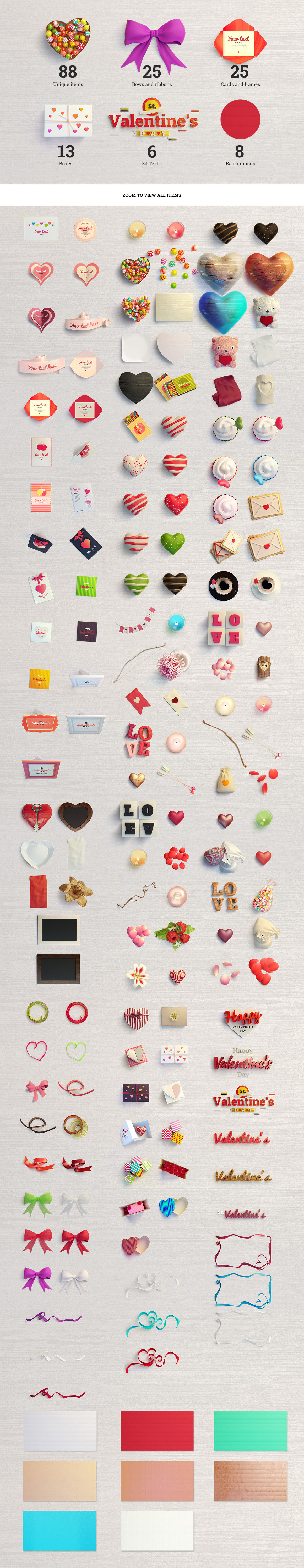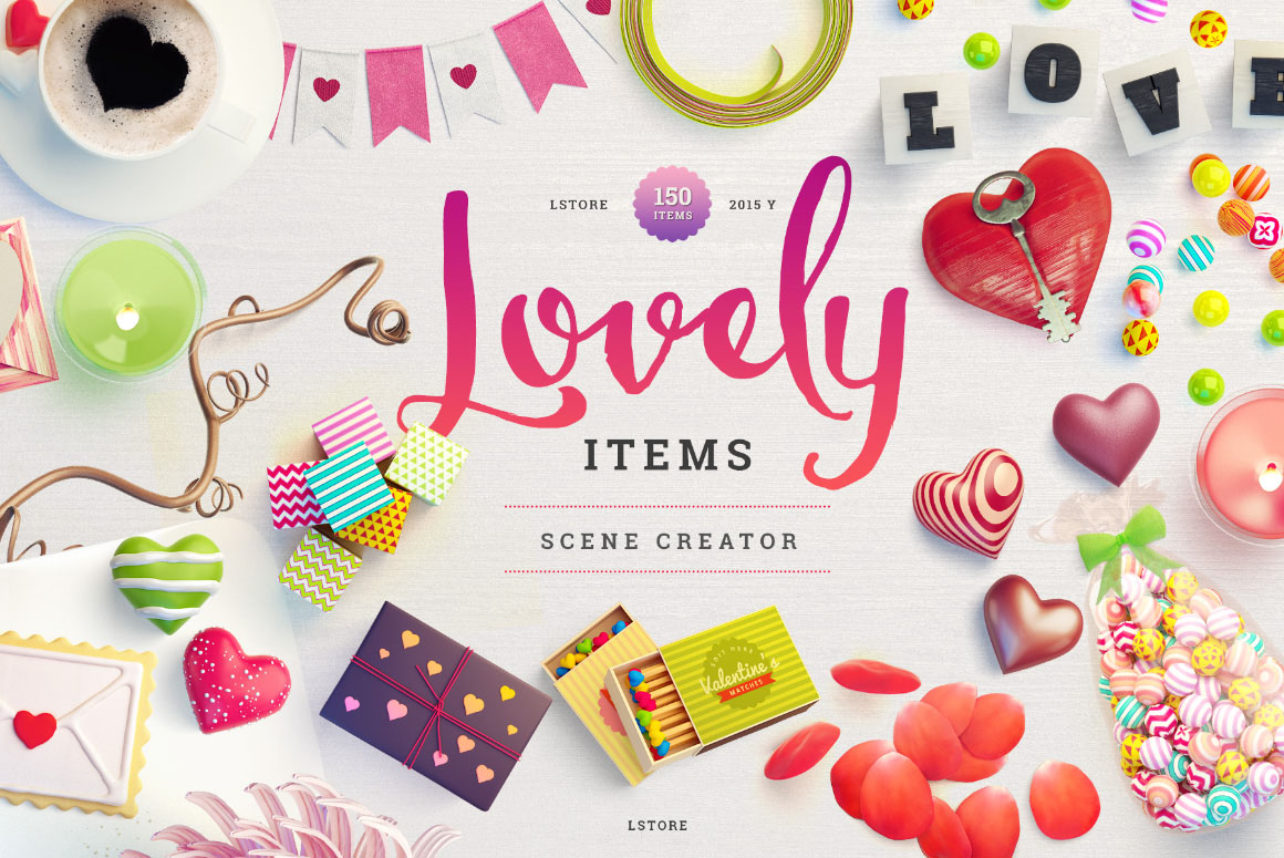 Greatest pack for creating Lovely Scenes. With 160+ items you can create unlimited variations of header/hero images. Every item was modeled, textured, rendered and retouched. Layered shadow in multiply mode for realistic view. Very handy and easy to use. Contains different postcards, valentine’s cards, pockets, valentine’s hearts, flowers, 3d typography, keys, candies, candles, plates, matches, bows, ribbons, cookies and many other items.