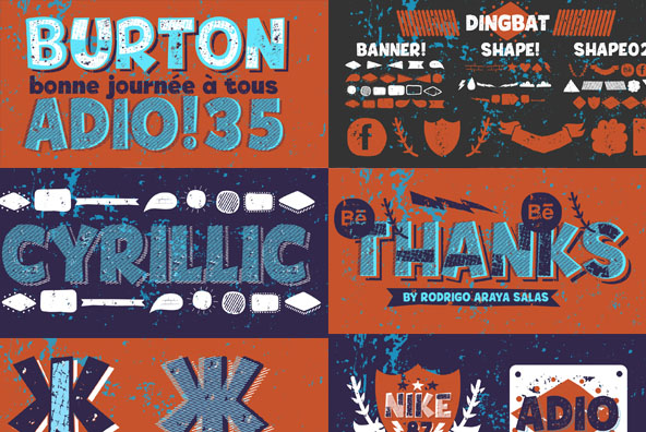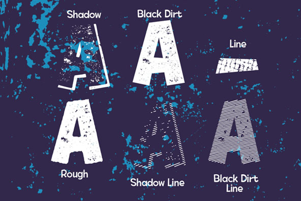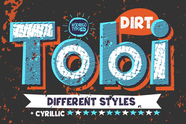 Tobi dirt, is a variant of “Tobi” this time it is presented in a dirty, rough with different styles and forms, the idea is to combine everything, and containing ornaments set with Cyrillic alphabet. -Tobi Dirt (Regular Version) -Tobi Dirt Rough (Regular Rough Version) -Tobi Layer ( Decorative Version) -Tobi Dirt Line ( Decorative Version) -Tobi Shadow ( Style Shadow ) -Tobi Shadow Line ( Style Shadow 02) -Tobi Dingbat Shape -Tobi Dingbat Shape 02 -Tobi Dingbat Banner -Tobi Light Dirt (Light Rough Version) -Tobi Light Dirt Line ( Decorative Version).