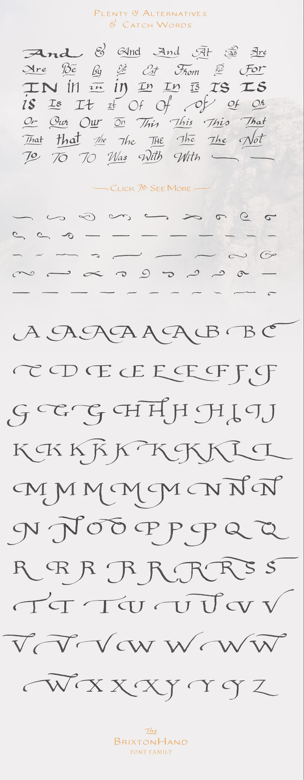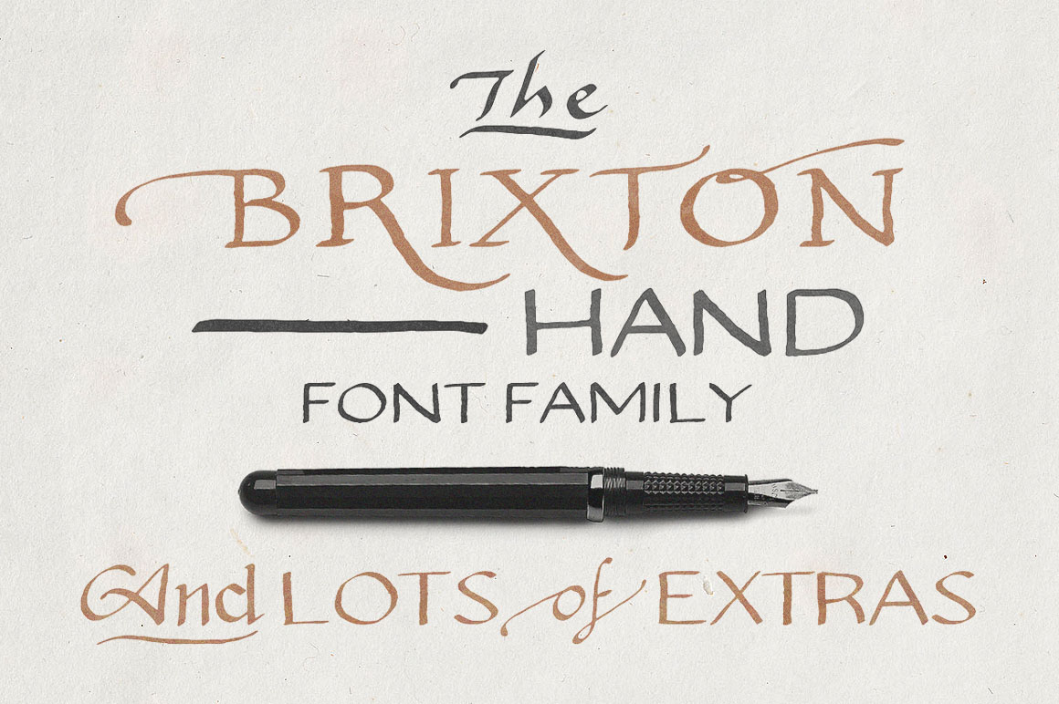 I am proud to introduce you to my handwritten ‘Brixton Hand’ font family. Within this bundle you will receive Brixton Hand, Brixton Hand Condensed, Brixton Hand Sans, Brixton Hand Sans Condensed, Brixton Hand Extras (Ornaments + Lines) and Brixton Hand Words (A bunch of useful and versatile Catchwords for you to enjoy!)