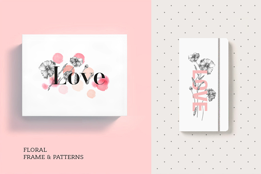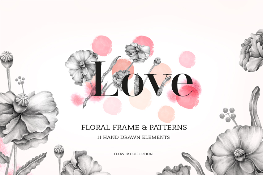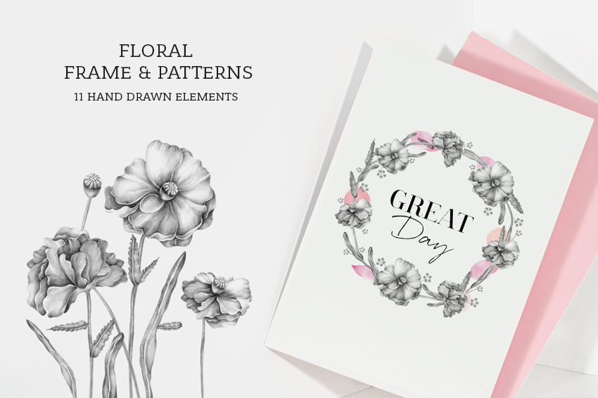 Floral hand drawn illustration and patters. It can be used as a design of greeting cards, posters, fabric, notebooks and so on. Perfect for wedding invitations and birthday cards.