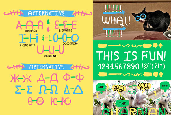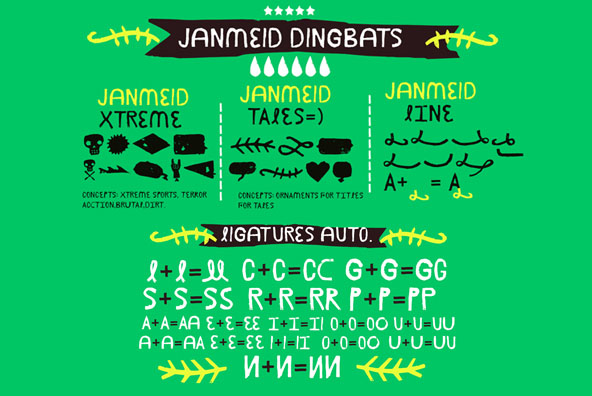 Concept: Janmeid, typography completely handmade, with all its accents and Cyrillic alphabets and Greek, has alternatives and various ligatures, also containing 3 dingbat set, the first is Xtreme, which is for powers titles horror, action, or Xtremes sports, the second is “tales” for stories powers or children’s titles, and the third “Line” Help letters to seem “Swash” something much more decorative, the idea is to make a sweet, crazy fun typography, restless.