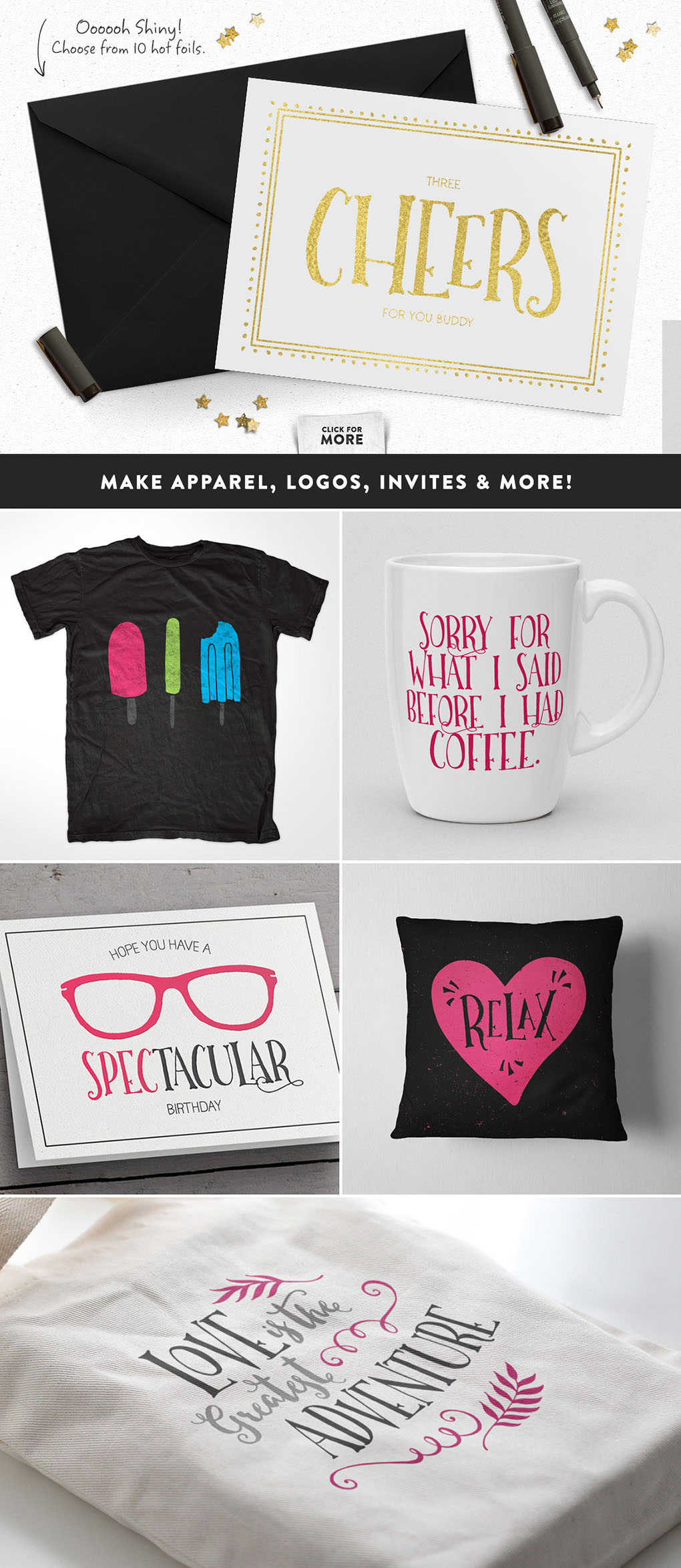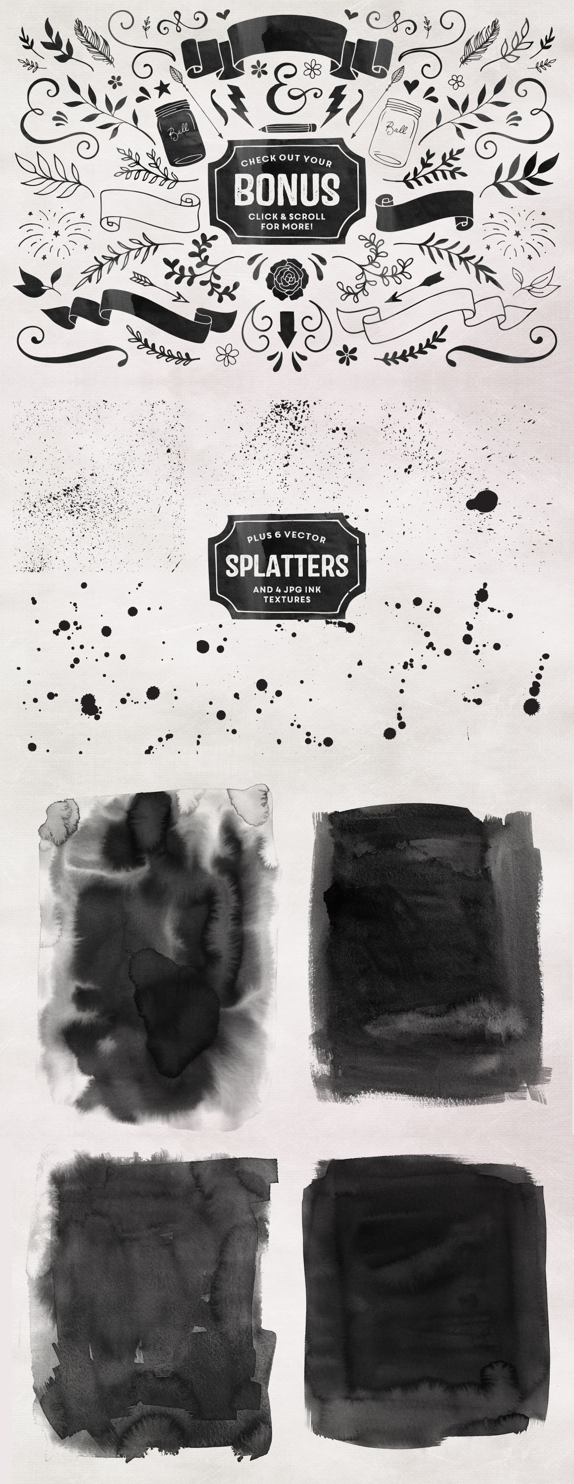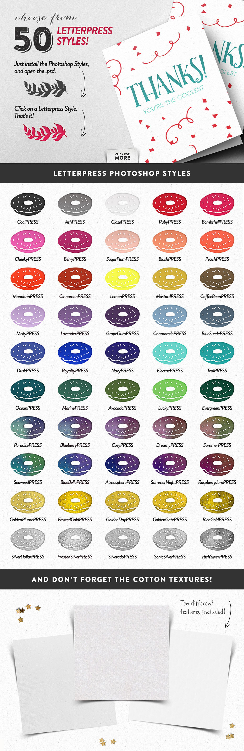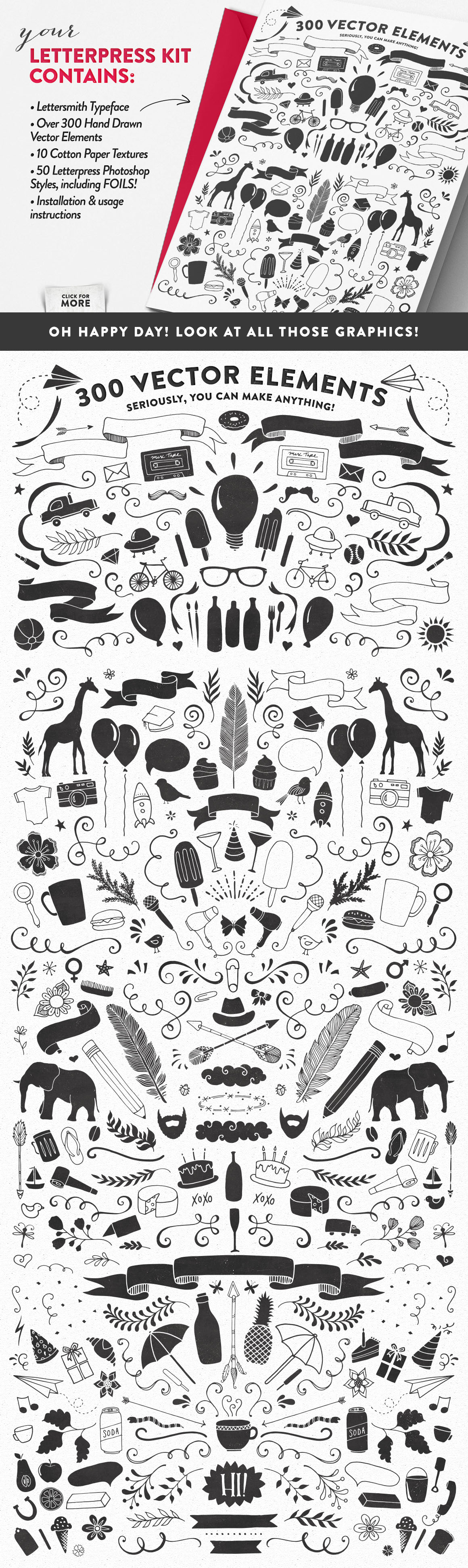 It’s no secret that I love all things hand-lettered, but recently, I also can’t get enough of letterpress printing! And with all the gorgeous script fonts in the marketplace, I wanted to create a fun typeface to compliment them. But of course, I couldn’t stop with just a font. Nope, I went ahead and hand-sketched over 300 vector elements, added 10 cotton paper textures, and designed 50 Letterpress Styles, so that you can make anything and everything you want.