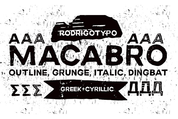MACABRO FAMILY, is a grunge typography, handmade whose concept, fear terror phobia among others, Cyrillic and Greek are also design also has several varieties, from italic, outline, rough, etc. and dingbats…
