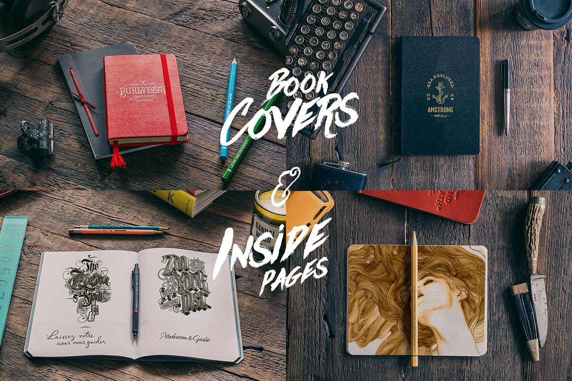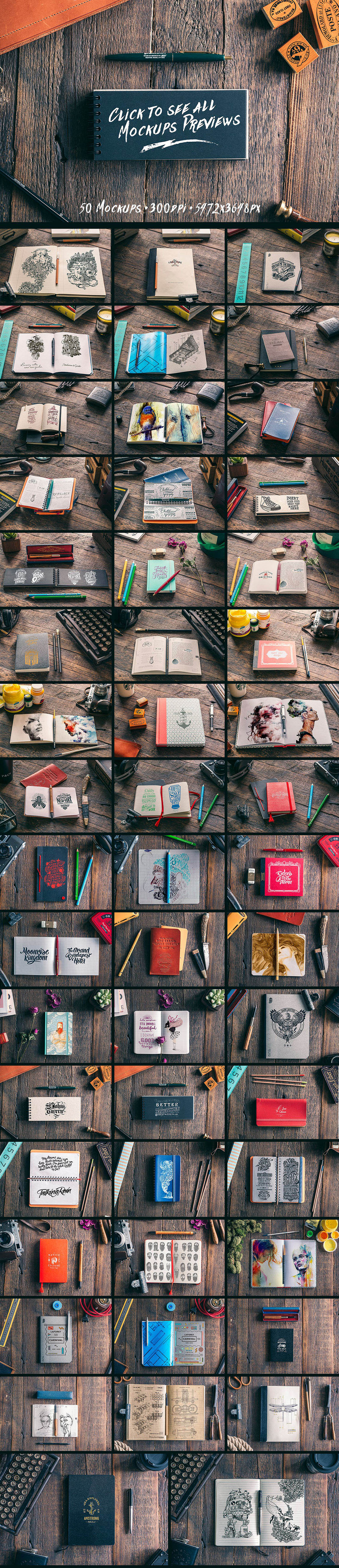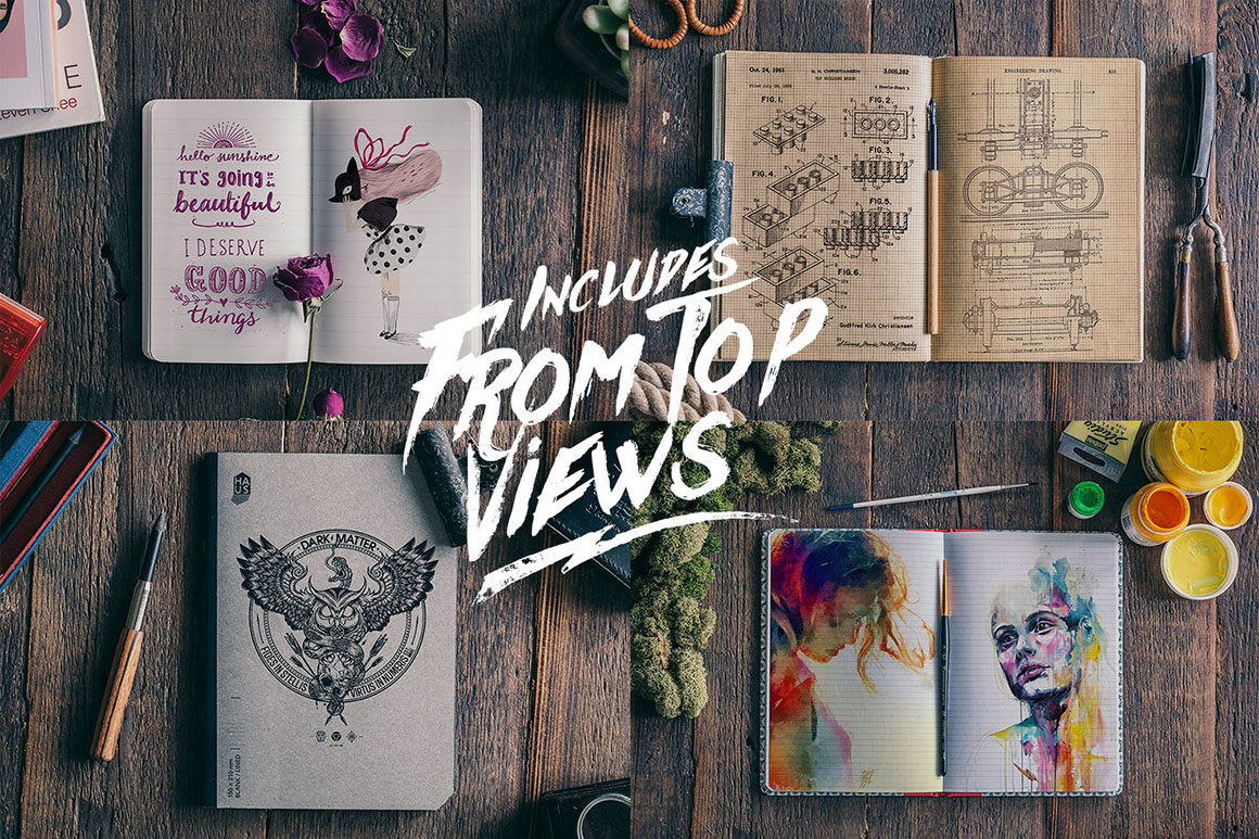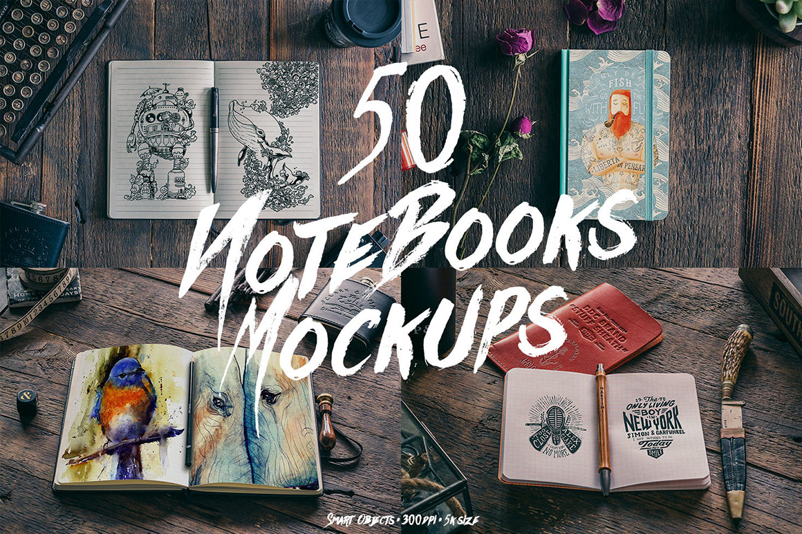 50 Amazing Hip Notebooks Mock-ups. 50 Hi-Res real photo mockups in 300 dpi with Smart objects. This is great for presenting your logos, sketches, notes, scrapbooks, doodles, drawings, art work, design wireframes, presentations, watercolours, photos or anything else. Each of 50 mockups are supplied with Smart Object for easy one-click replacement with your original designs.