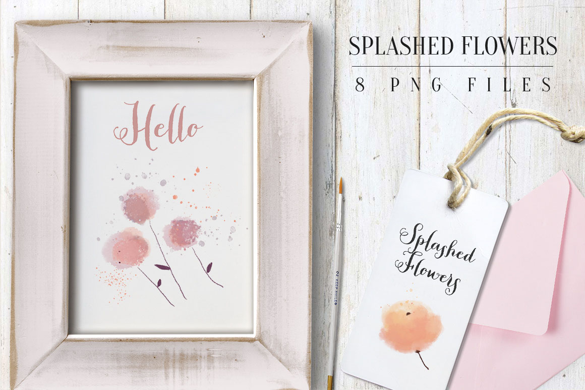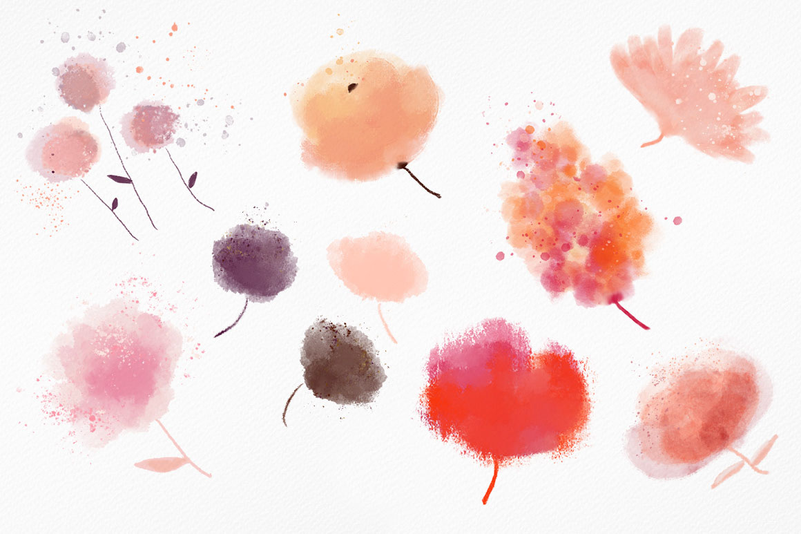 Splashed flowers – floral handmade clipart – Ideal for invitations, wedding invitations, handmade craft items, scrap booking, printed paper items and more. 8 x png file – 300 dpi size: 2″- 3″