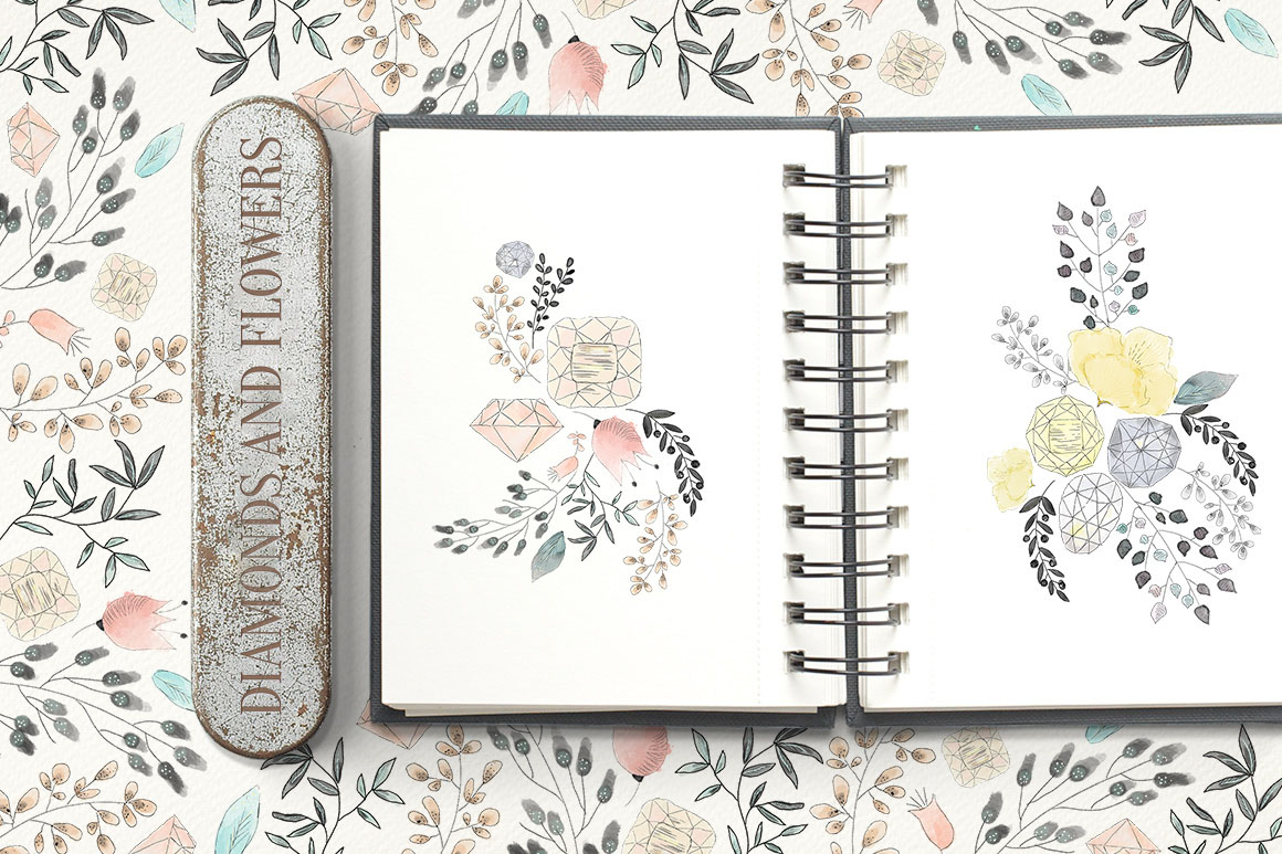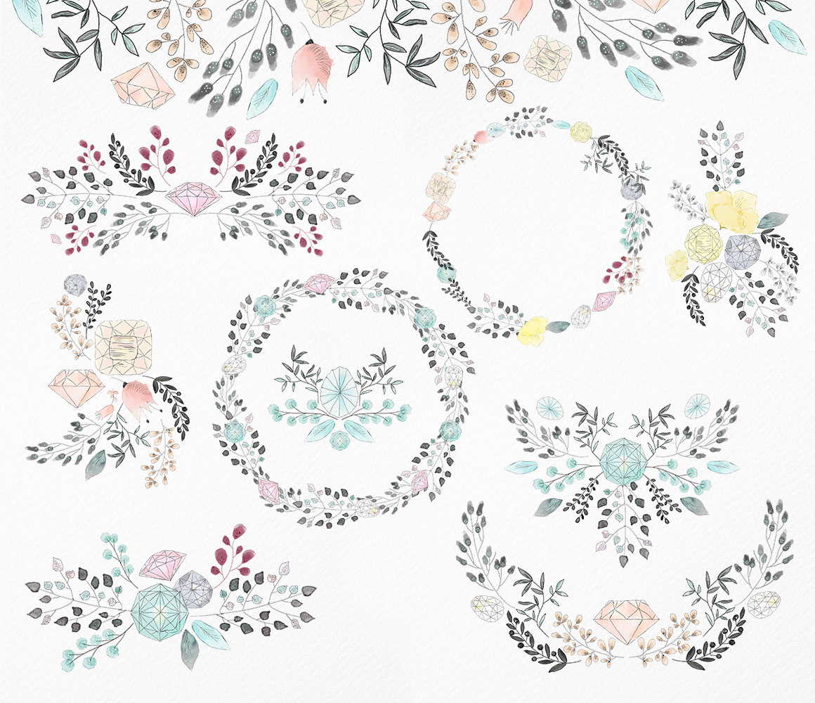 Diamonds and flowers – floral handmade clipart – Ideal for invitations, wedding invitations, handmade craft items, scrap booking, printed paper items and more. 10 x png file – 300 dpi size: from 4″- 11″