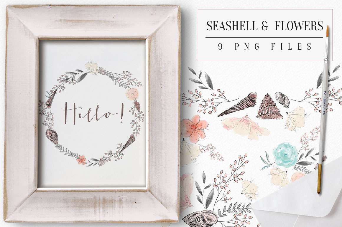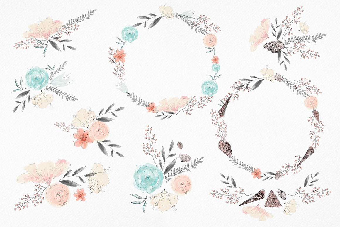 Seashells and flowers – floral handmade clipart – Ideal for invitations, wedding invitations, handmade craft items, scrap booking, printed paper items and more. 9 x png file – 300 dpi size: from 7″- 11″