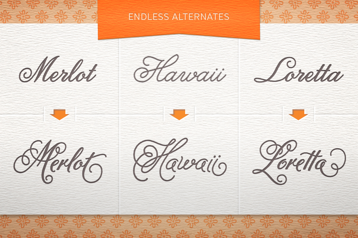 Melany Lane from Yellow Design Studio is a flourishy script based on traditional letterforms, but with the added quirks and warmth of hand-drawn type. The base character set has traditionally connected letters and an expressive charm. Contextual alternates add flair with unconnected letters and additional contour options. Mix in swash and stylistic alternates for extra funkiness and fun.