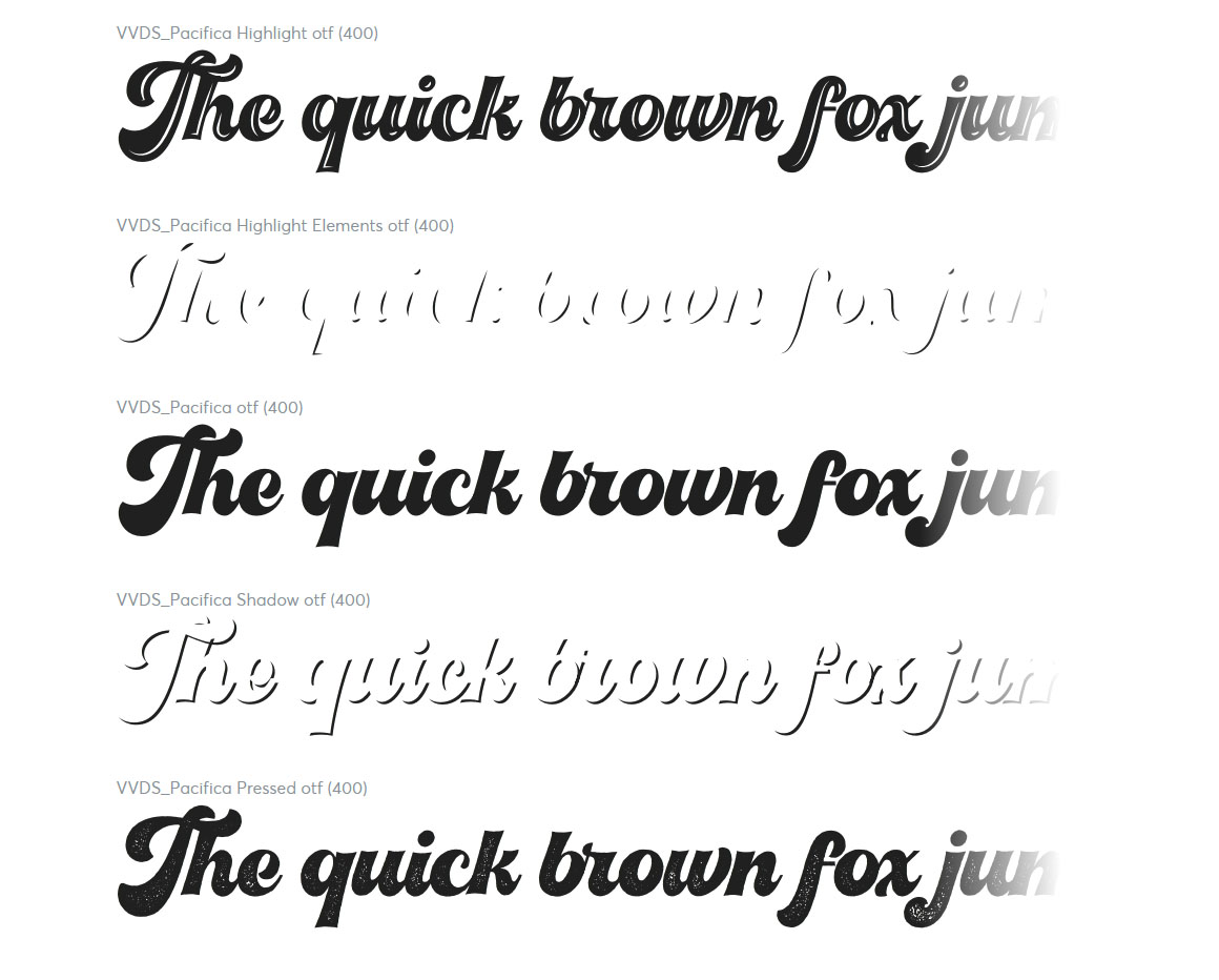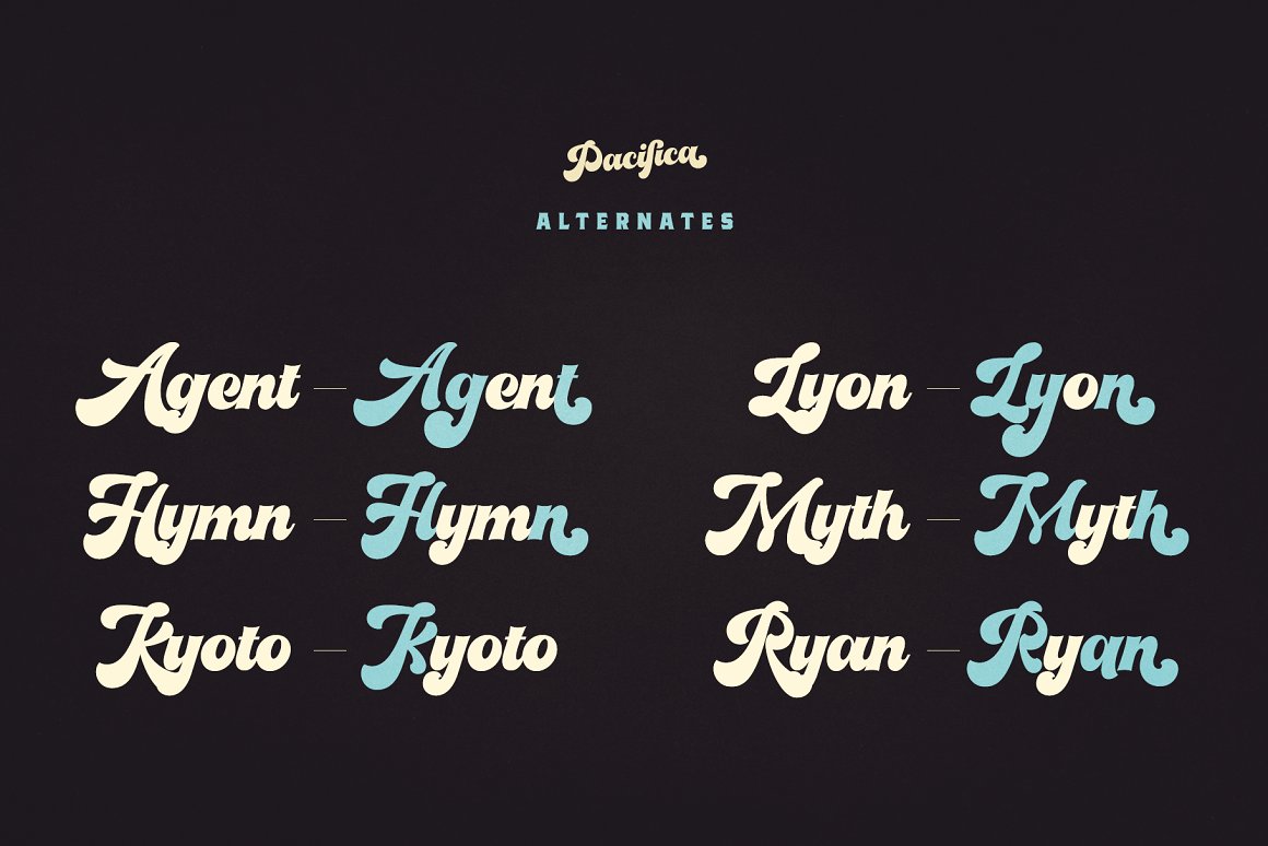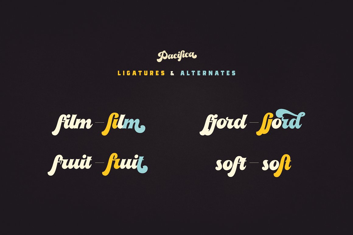 Pacifica – hand lettered elegant bold script for decorative typography inspired by American branding typography from end of XX century. Comes with different variates – filled, highlighted or pressed. Perfectly for headers, signs, logos, prints, etc. Comes with ending and some middle alternates and some standard ligatures.