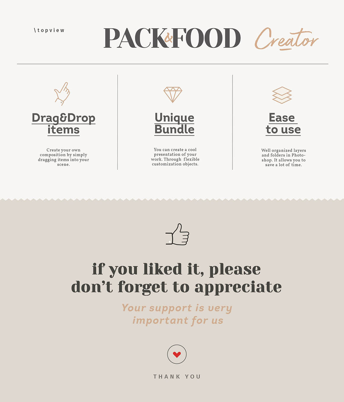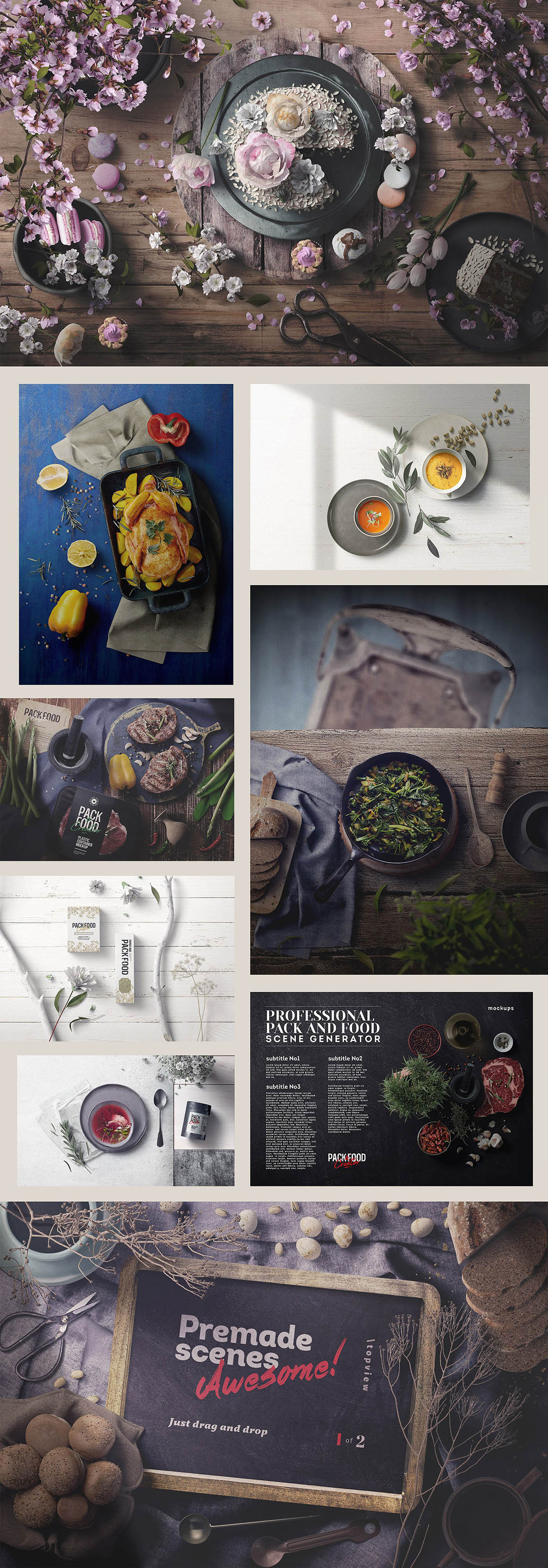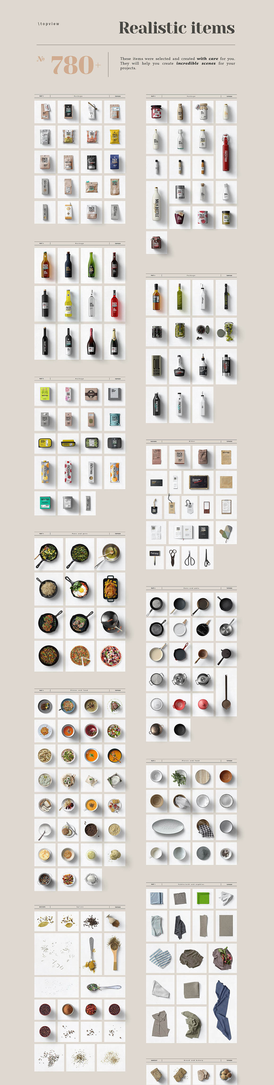 If you are looking for some professional kitchen, food or packaging 3D scene creator for Adobe Photoshop with attractive TOP view then you are at the right place because here you will get amazing bundle with 20 premade scenes & 780+ unique items in kitchen or food theme. Great for your branding, headers, web projects, art projects, typography or any print projets!