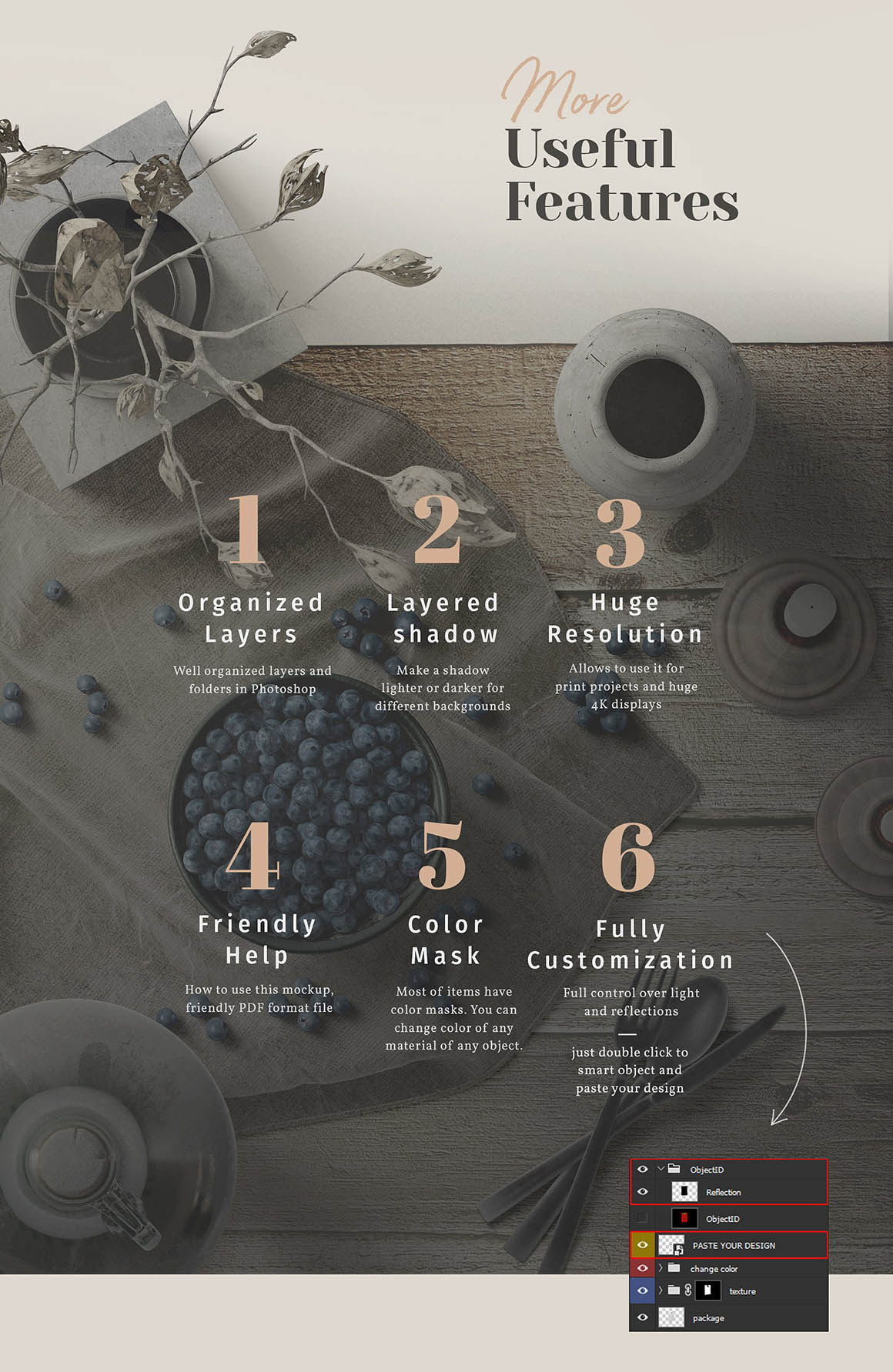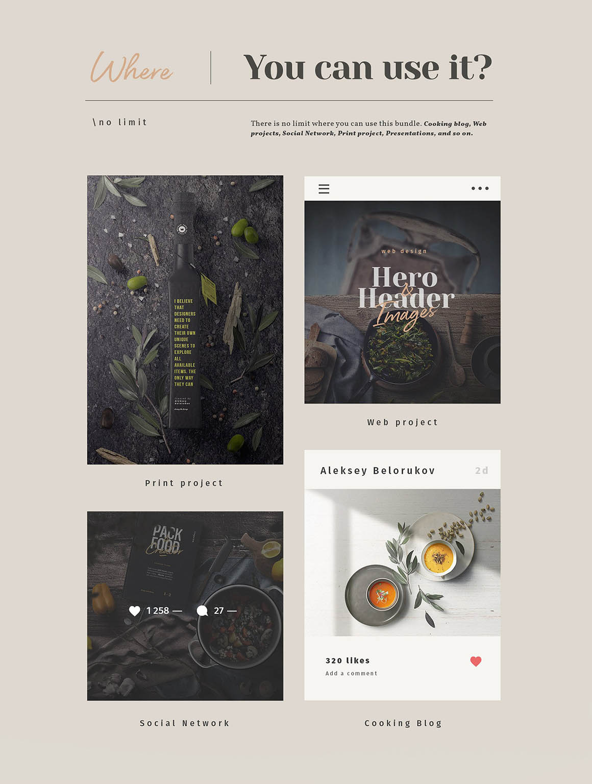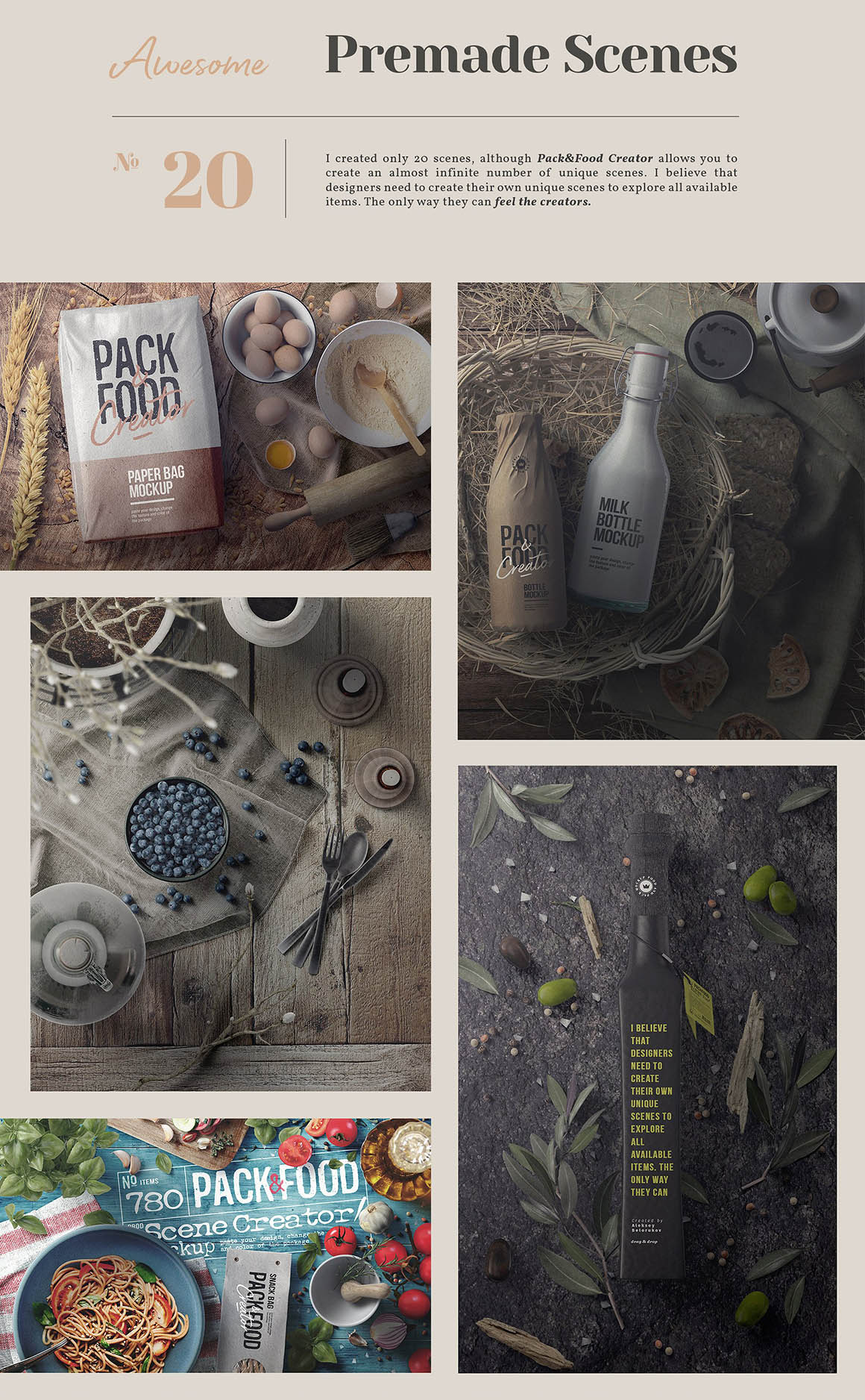 If you are looking for some professional kitchen, food or packaging 3D scene creator for Adobe Photoshop with attractive TOP view then you are at the right place because here you will get amazing bundle with 20 premade scenes & 780+ unique items in kitchen or food theme. Great for your branding, headers, web projects, art projects, typography or any print projets!