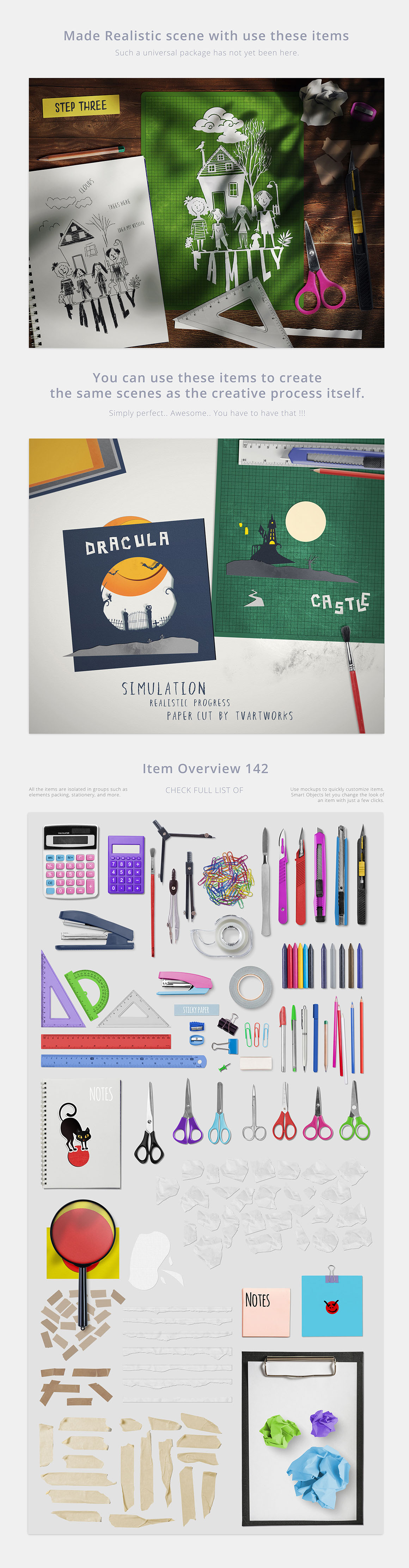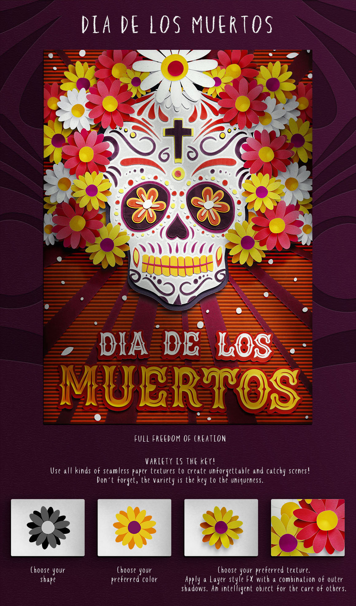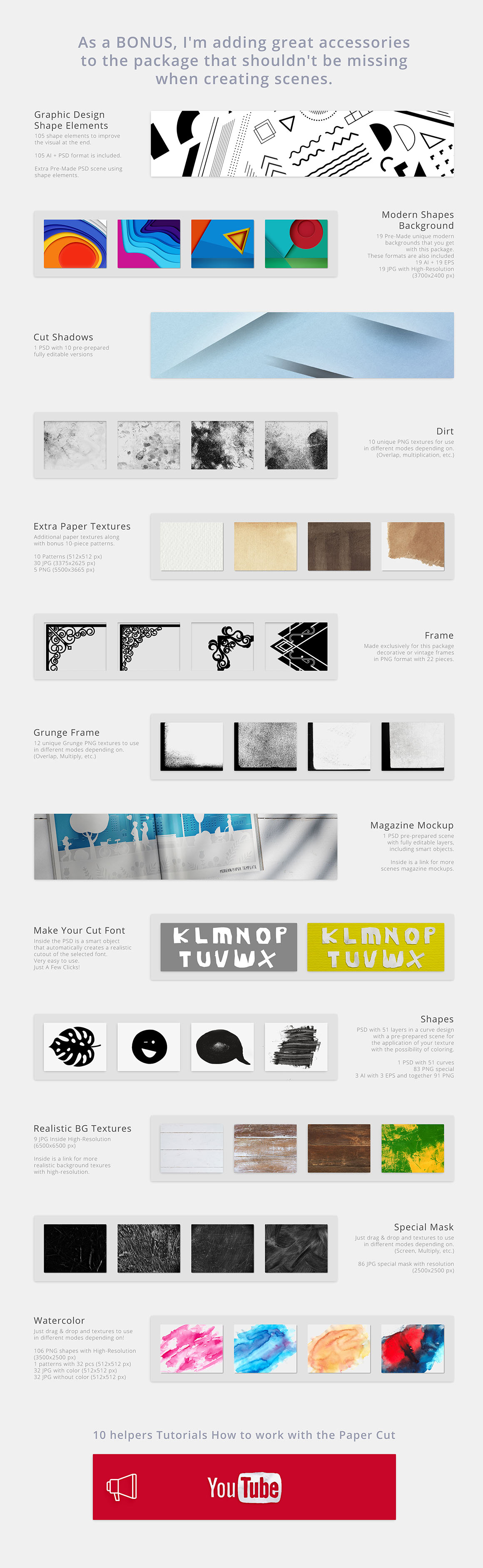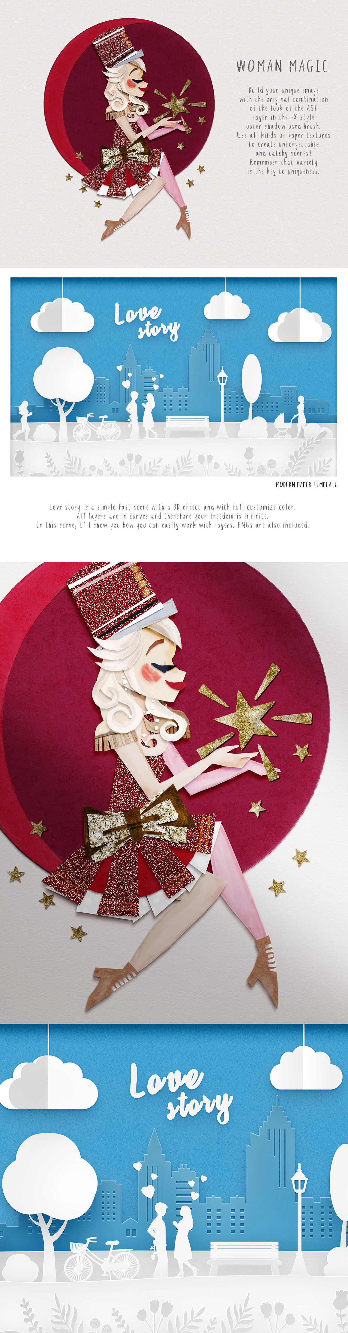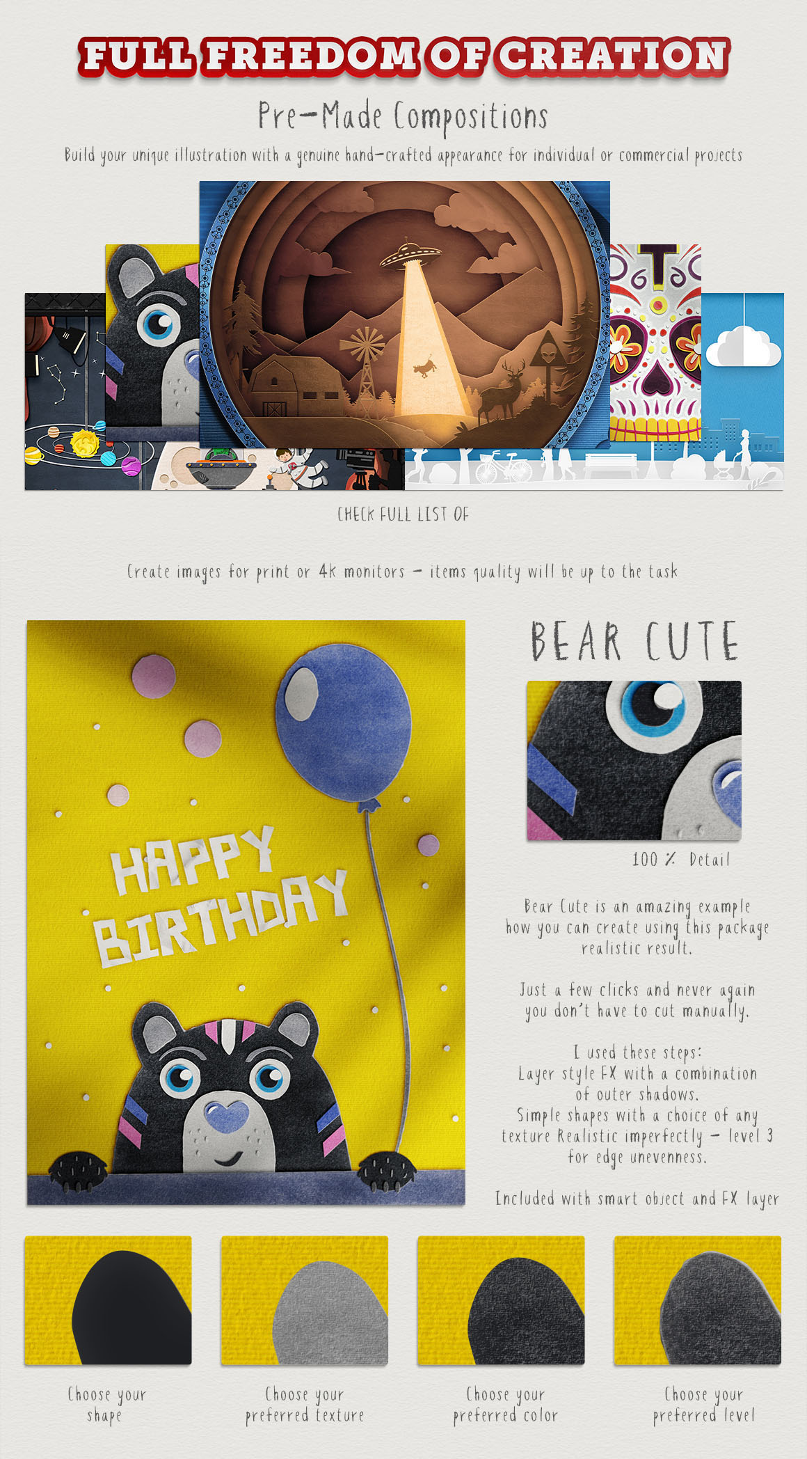 You’ll need Adobe Photoshop to play with all these premade scene templates, paper cut effects templates, seamless patterns, textures and lot of other graphics and fonts ideal for this handmade style graphics! This bundle is complete pack of graphics you’ll need 🙂