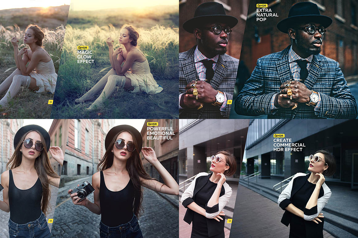 HDR categories include actions: HDR • Detail Extractor • HRLA • Clarity • Boost Details • Highlights Recovery • Shadows Recovery • Lights Detailed • Darks Detailed • Make-It-Glow • Make-It-Glow v2