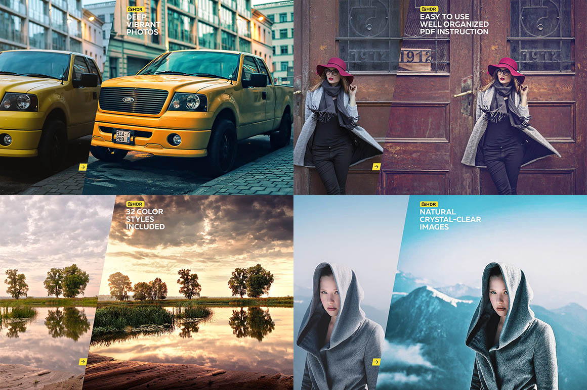 HDR Effect • Photoshop Action • Easy to transform your photos into HDR • 32 color presets include • Just 1 Click to Apply an Amazing Effects On Your Photo • Easy to use • Well organized layers • Fully editable layers • Easy to customize • Non-destructive • This action has been tested and works on Photoshop CS3 – CC2017 • Recommended to use high resolution photo sizes between 2000 – 10000px • Help document included