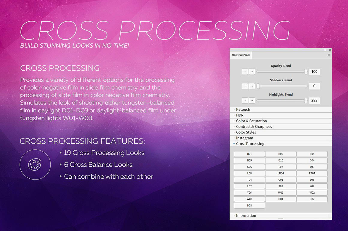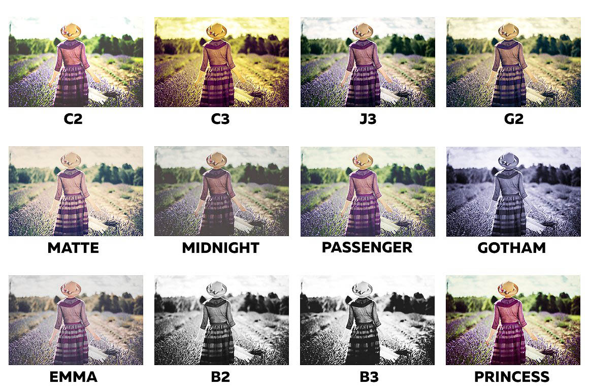 This collection of 20 presets for photographers and graphic designers will help get looks: Instagram and VSCO filters, cross-processing, colorful, dramatic, HDR, vintage, and film.