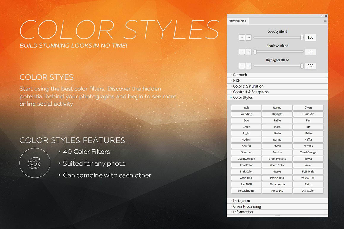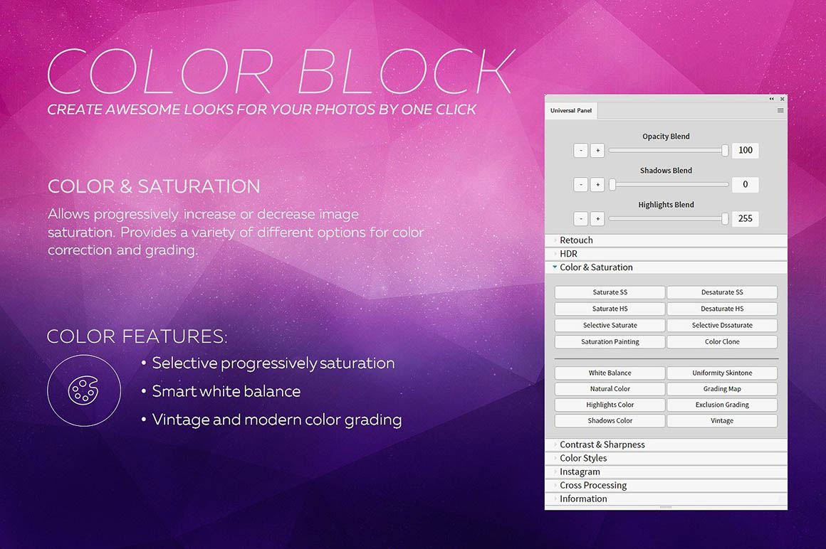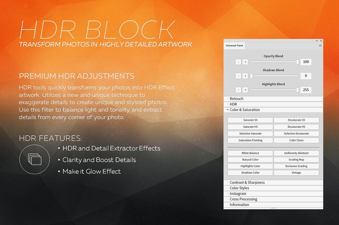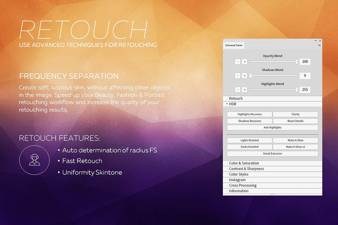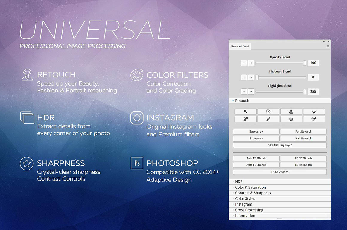 Universal Photoshop Panel is comprehensive set of presets for color correction and getting original Instagram and VSCO looks, HDR, retouching and creative effects which is perfect for photographers, graphic designers and retouchers. This is a powerfull suite of Photoshop Scripts, designed to drastically improve workflows for processing and editing any photos. With this Panel you will be able to quickly and easily add a professional finish to your images. This Premium Photoshop Panel is a MUST HAVE for any photographers.