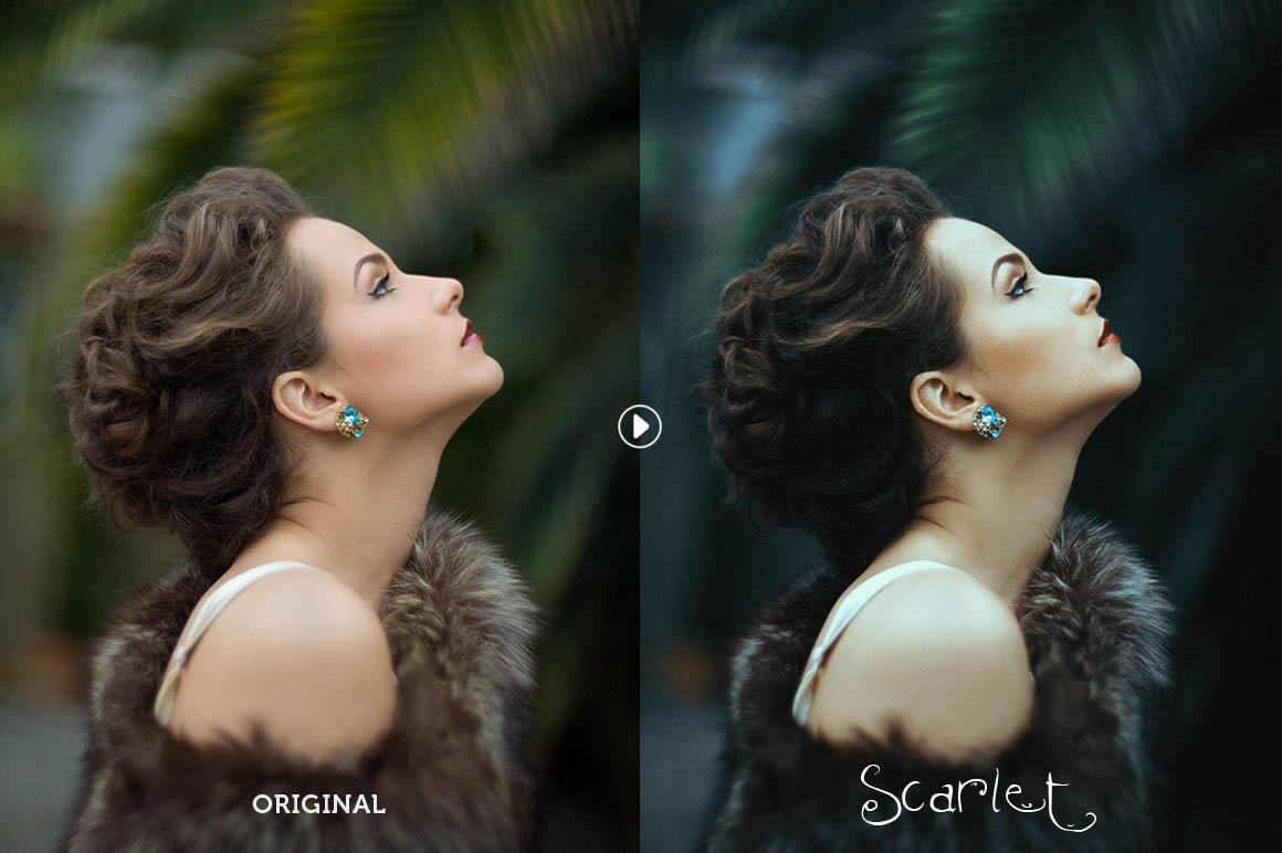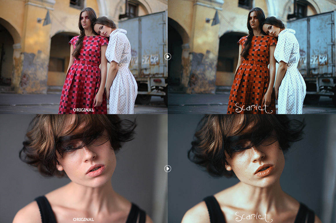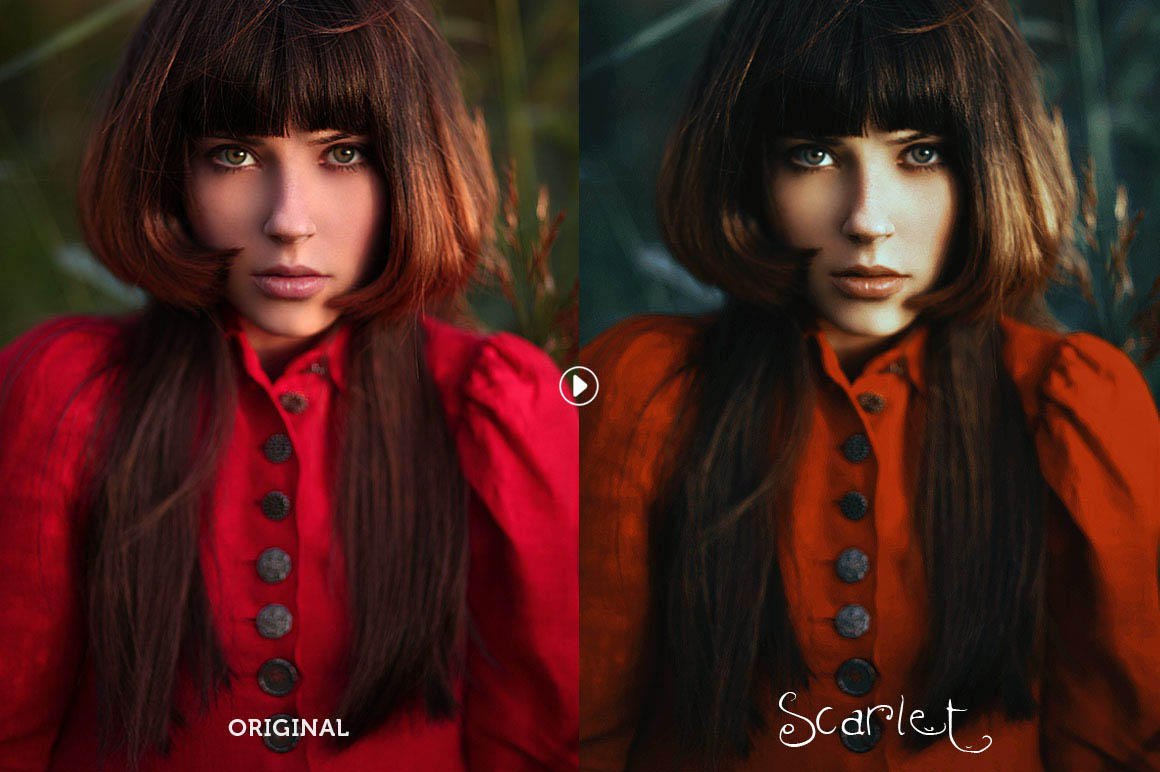 Scarlet Photoshop Action is an advanced fantasy toning for natural light portraits, fashion and fine-art. It will add a rich atmospheric/fantasy tone to your photographs and give them a professional editorial look. Being specially designed for warm-palletted portraits made during sunset/sunrise, it should also go well with other and more brighter outdoor/natural light photographs (darker version of the action included in the set).
