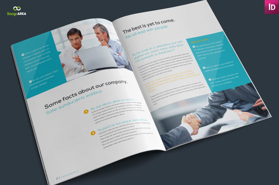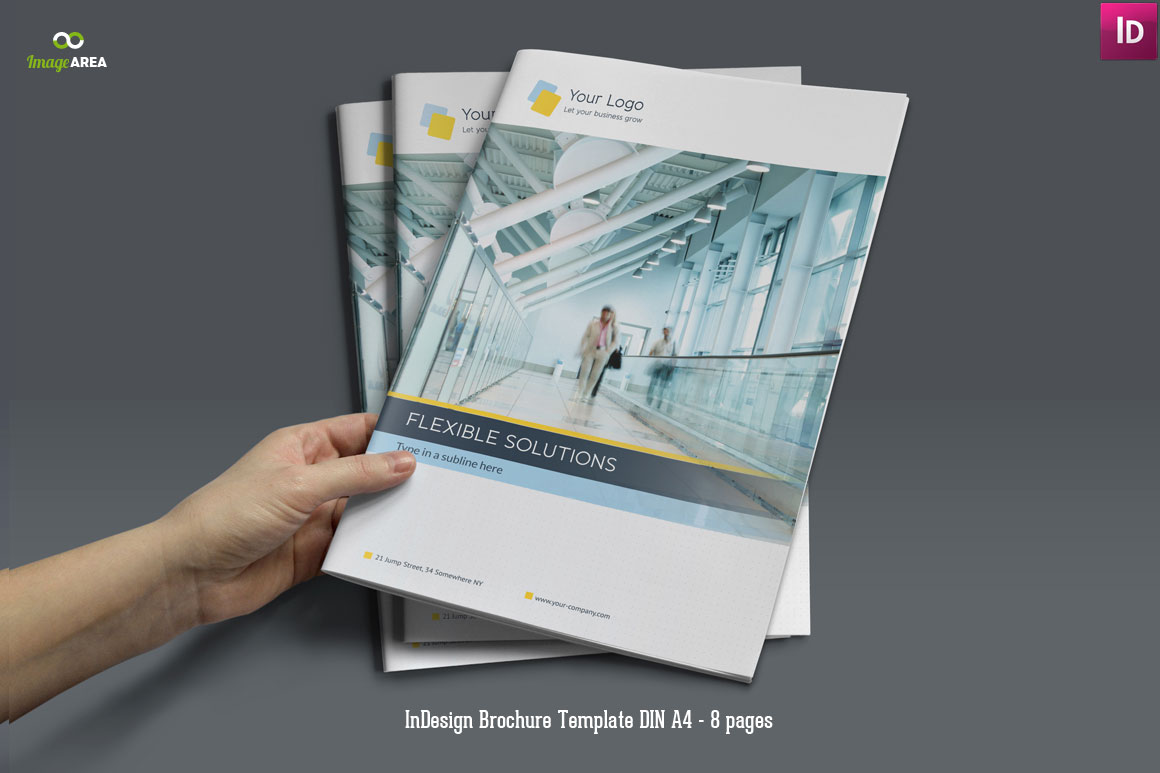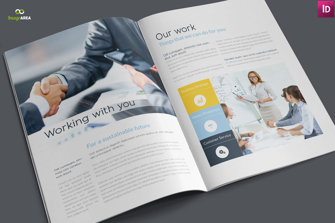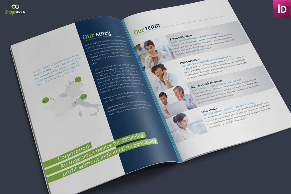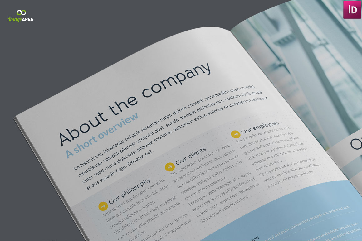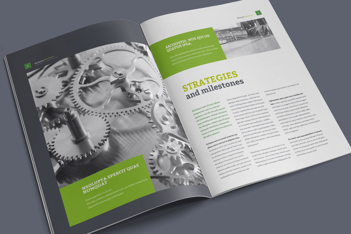 This is an InDesign template for an 8 page corporate brochure. The format is A4 (8.2×11.6 inches) with 3 mm bleed all around. The files are fully editable and print ready. The images are not included, but all graphics as vectors. Paragraph and character styles included, master pages included.