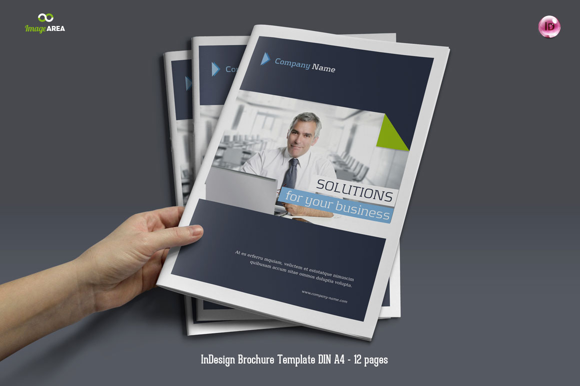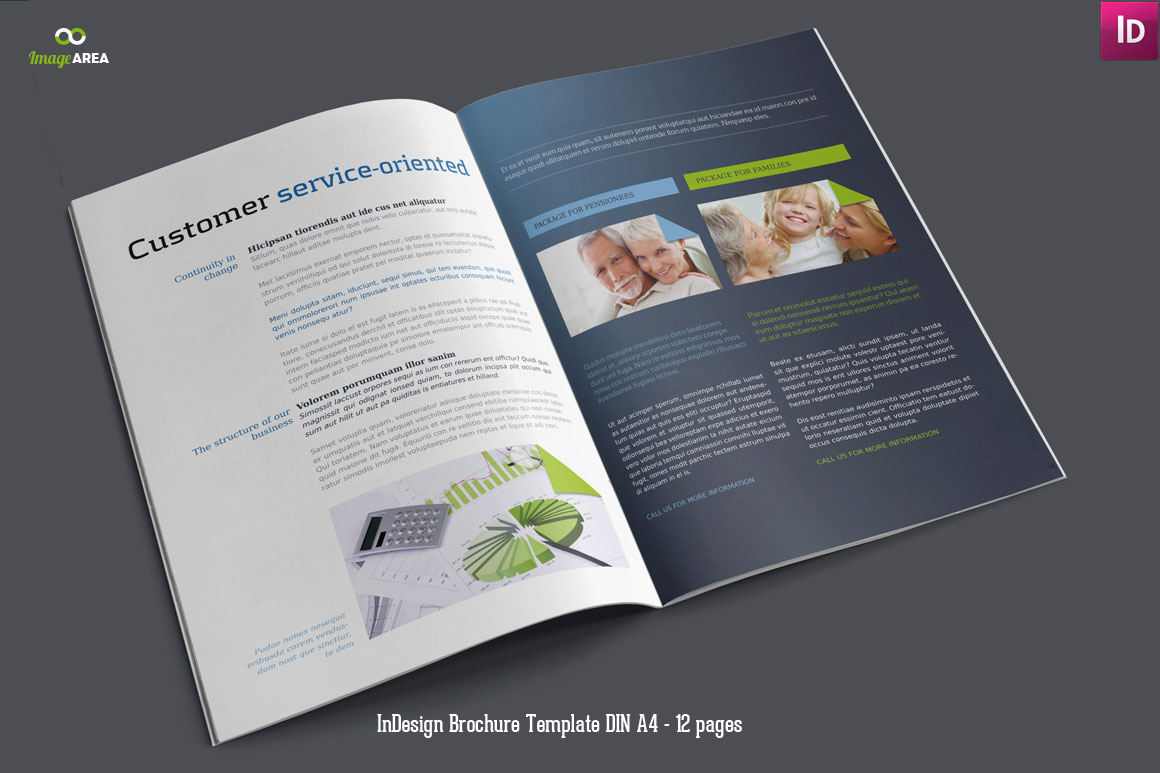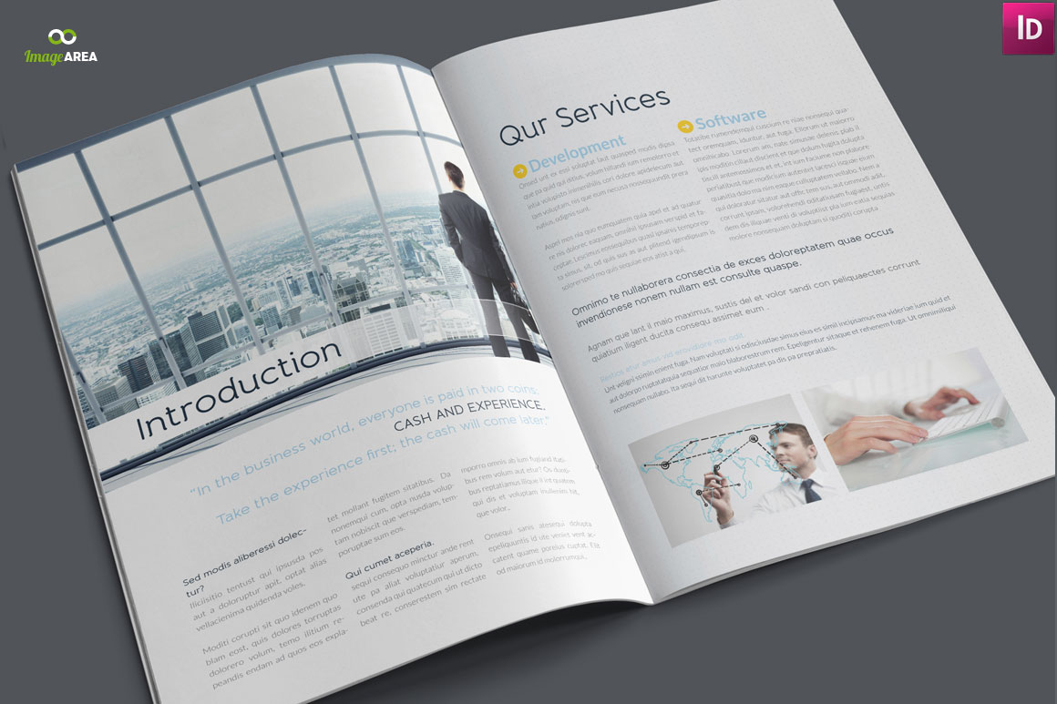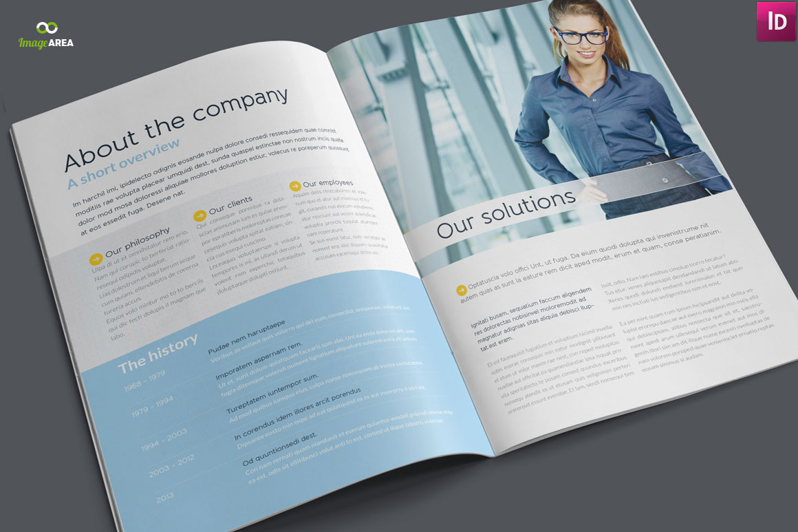 This is a modern and powerful template for a 12 page brochure. The format is A4 (8.2×11.6 inches) with 3 mm bleed all around. The files are fully editable and print ready. The photos are not included, but a link in the download file, where you can buy them. Graphics are as vectors included. File contains paragraph and character styles, also master pages.