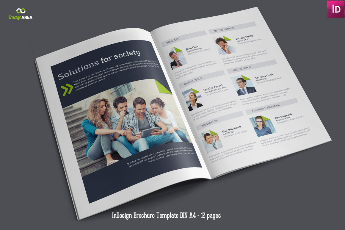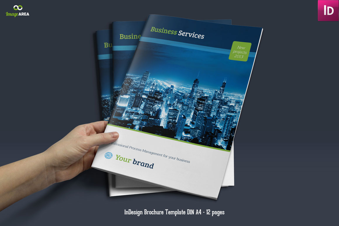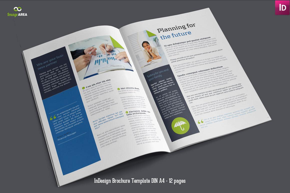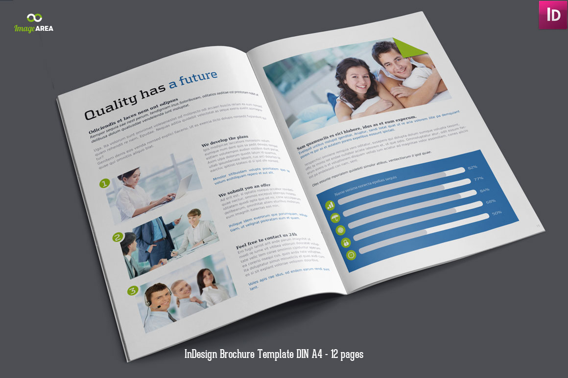 This is a modern and powerful template for a 12 page brochure. The format is A4 (8.2×11.6 inches) with 3 mm bleed all around. The files are fully editable and print ready. The photos are not included, but a link in the download file, where you can buy them. Graphics are as vectors included. File contains paragraph and character styles, also master pages.