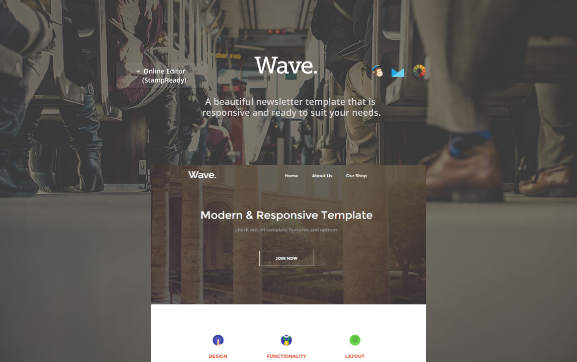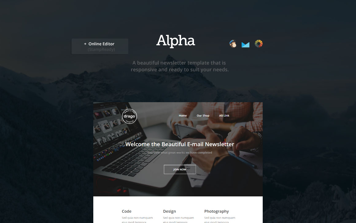 Info about how to set up the template for MailChimp or Campaign Monitor and also with info about StampReady online builder • Drag & Drop modules • Duplicate or hide modules • Unlimited Modules and Colors • Full Width Design & Responsive • Documentation •