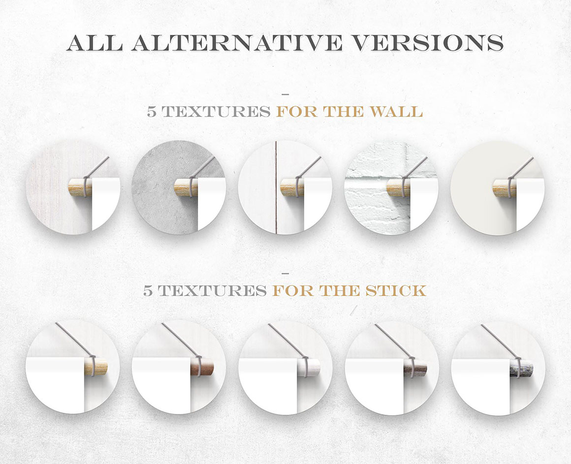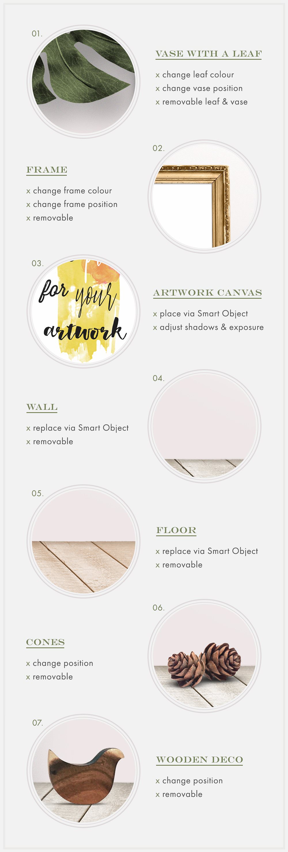 - 5 different wall backgrounds (plain color, concrete, white planks, white bricks & bright wood)