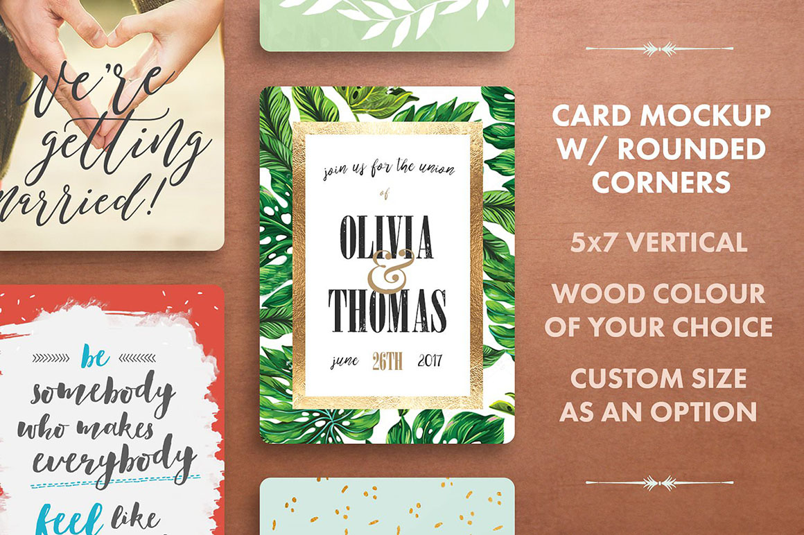 Cards, Invitations and all other prints with rounded corners also deserve a solid mockup! That’s why we created simple yet powerful tool to let you show your rounded goods in style in seconds.