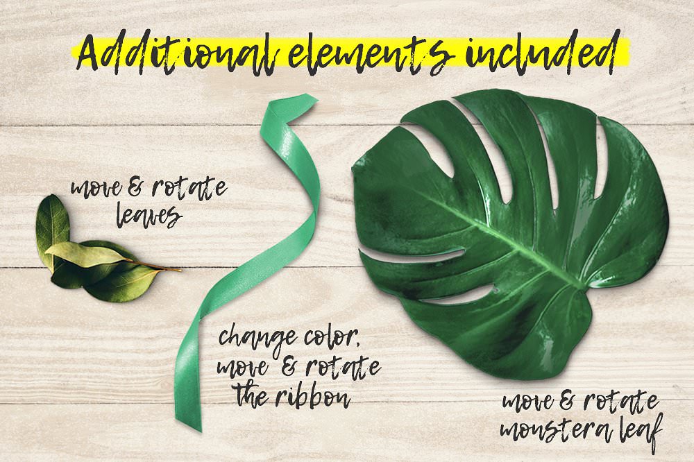 - decorations: monstera/phylodendron leaf, twig leaves, moss, knobs, magnifying glass, ribbon with editable color