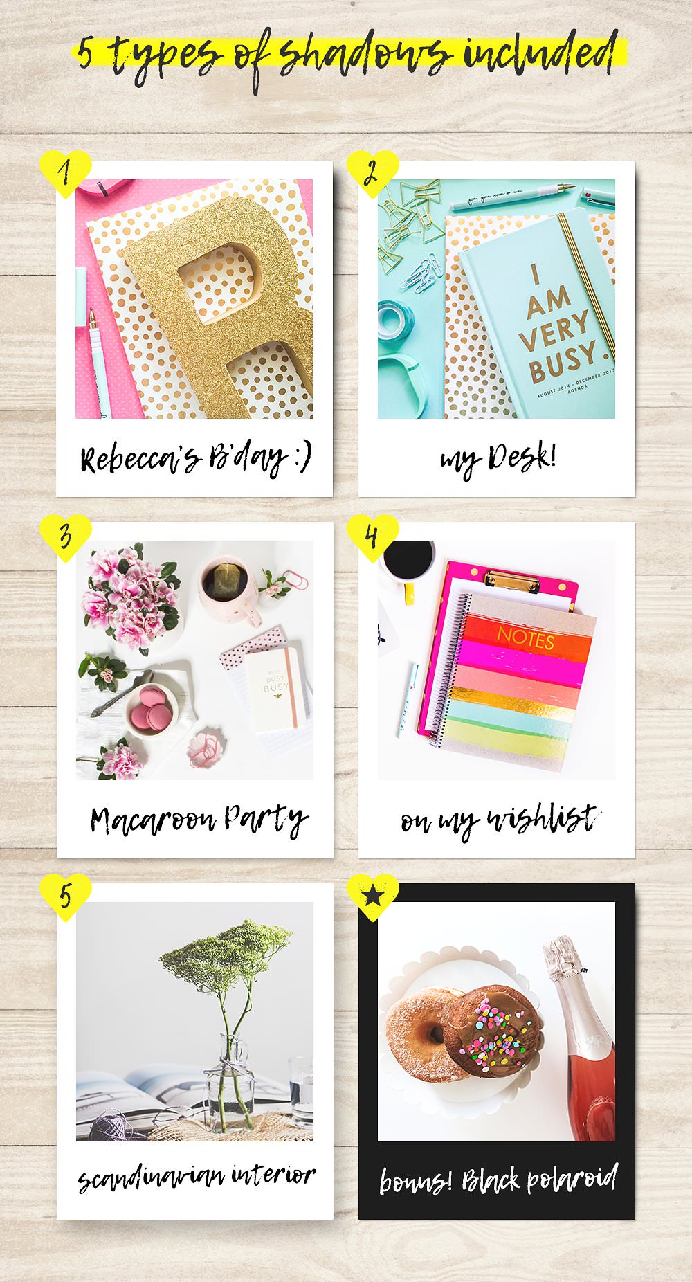 - all you can see is included inside: 6 Polaroids types (different shadows), Monstera flower, leaves, captions and a ribbon (you can chainge its color),