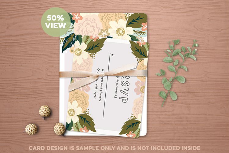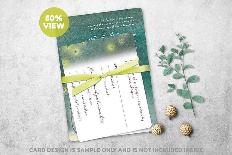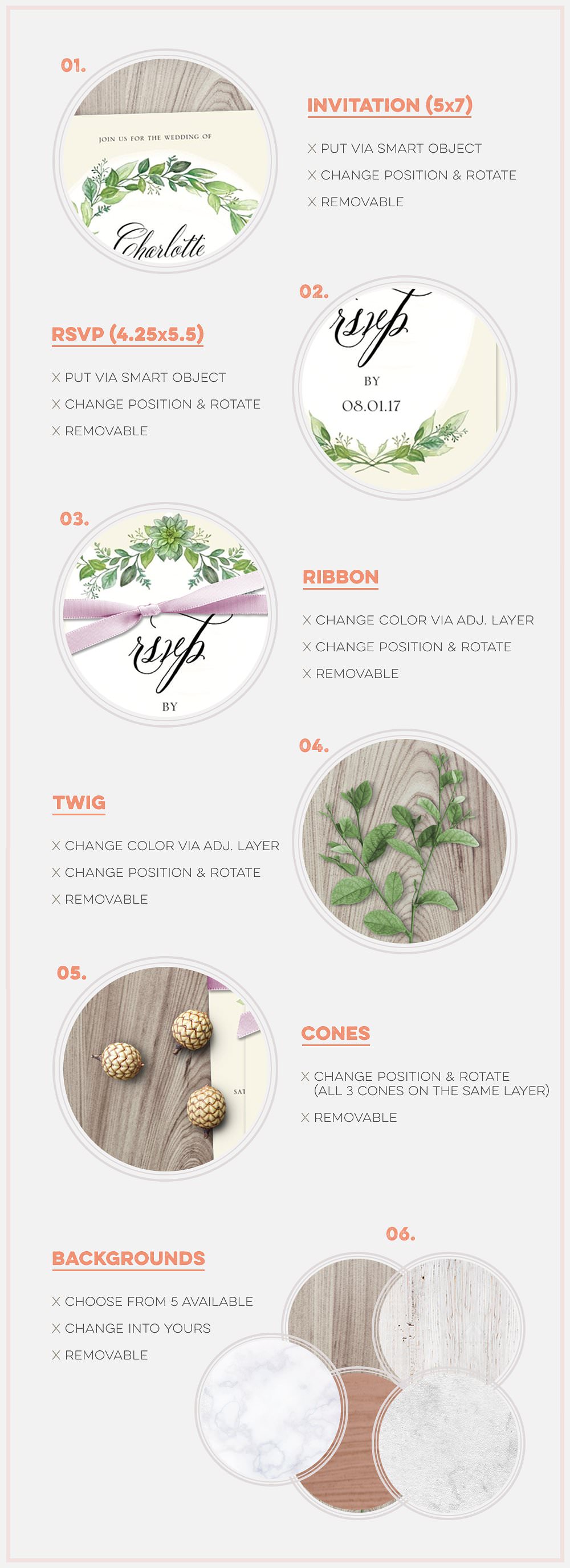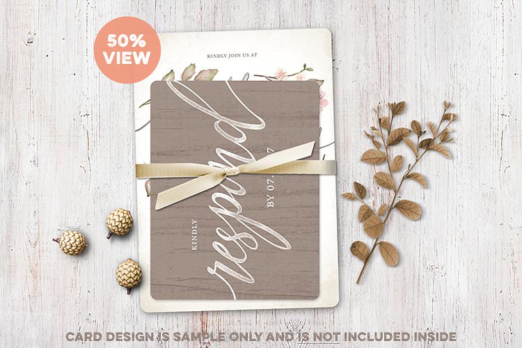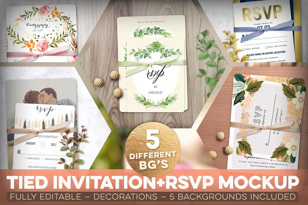 Comprehensive mockup for your invitation and RSVP with elegant ribbon and decorations is right here! Put your prints with just two clicks, choose background and play with decorations ― so much fun, instant effect! Looks like very good, realistic photo and all you need is few clicks (literally!).