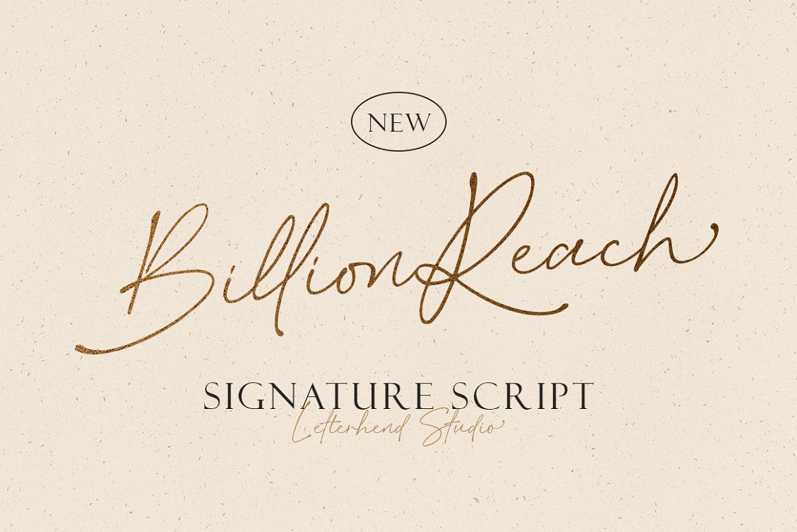 Introducing, Billion Reach – A beautiful signature script based on manual hand writing. The stylistic alternate and the ligatures make this font looks a real hand writing instead of typing a font. This type of font perfectly made to be applied especially in logo, and the other various formal forms such as invitations, labels, logos, magazines, books, greeting / wedding cards, packaging, fashion, make up, stationery, novels, labels or any type of advertising purpose.