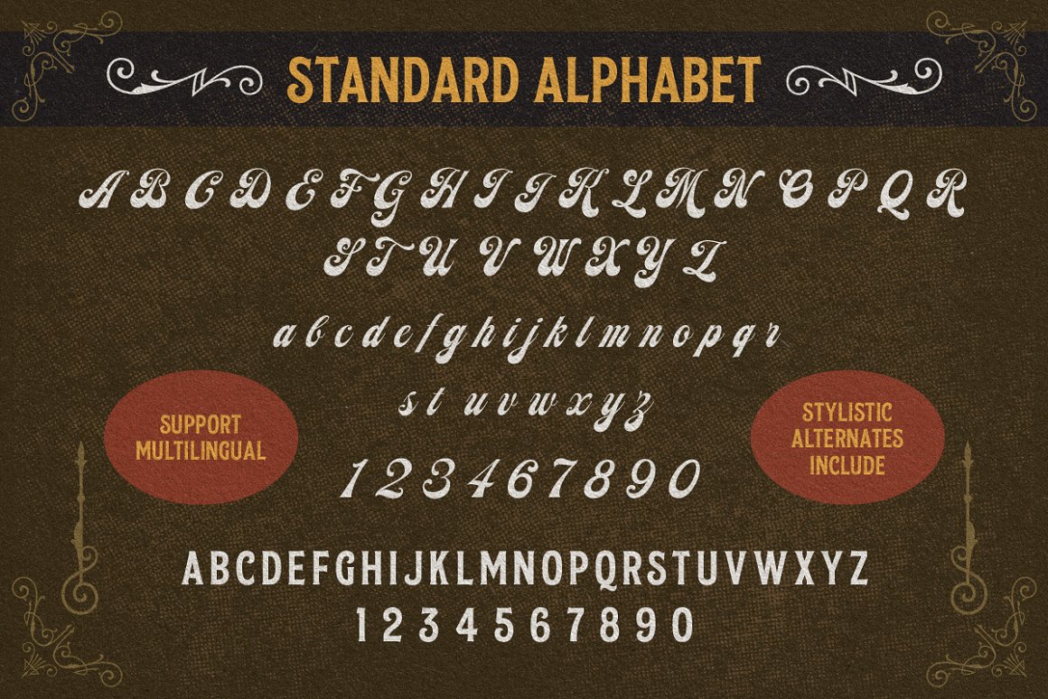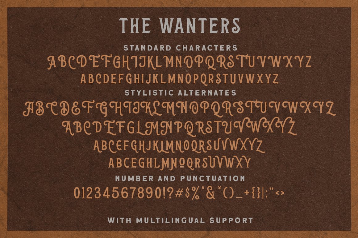 Introducing, The Wanters. A vintage display typeface with the touch of nostalgic feel yet still looks luxury in a modern design concept. This typeface has unique looks and strong character with its ornament / swashes. This font perfectly made to be applied especially in logo, and the other various formal forms such as invitations, labels, magazines, books, greeting / wedding cards, packaging, fashion, make up, stationery, novels, labels or any type of advertising purpose.