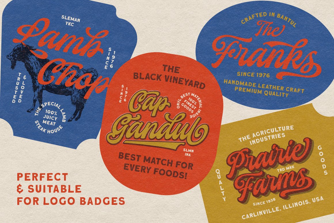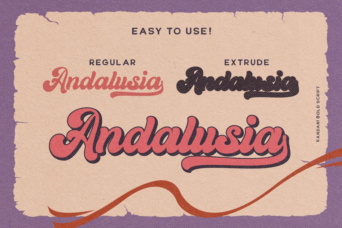 Introducing, Kandani. A retro bold script which will bring you back to 60s feel. This typeface has the extrude version so you can create your retro effect font in ease. This font perfectly made to be applied especially in logo, and the other various formal forms such as invitations, labels, logos, magazines, books, greeting / wedding cards, packaging, fashion, make up, stationery, novels, labels or any type of advertising purpose.