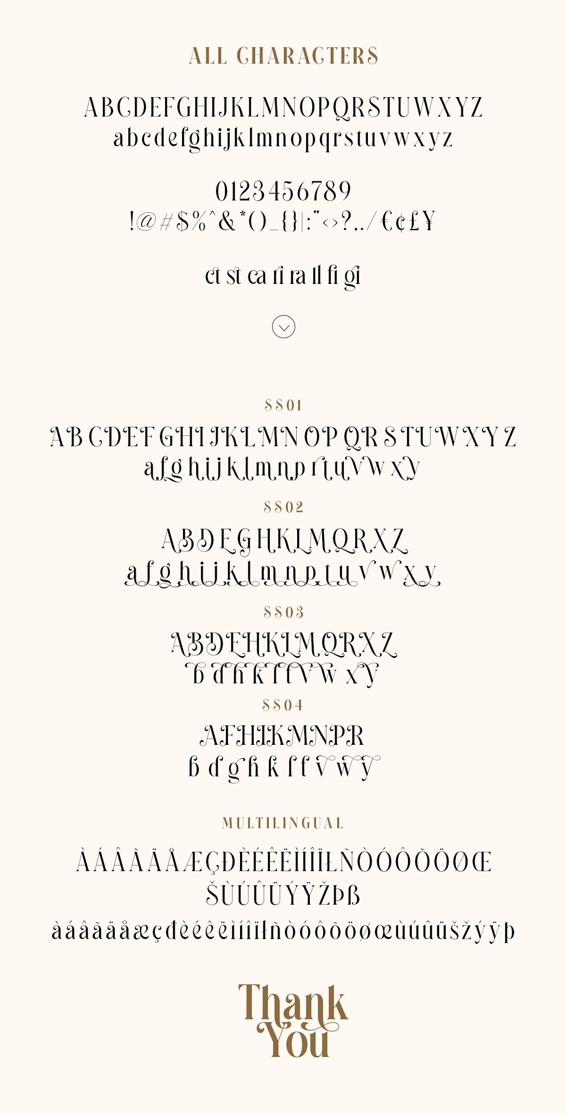 Ready to choose according to your needs. This typeface also has special feature with its ligatures which make it unique even more. This type of font perfectly made to be applied especially in logo, and the other various formal forms such as invitations, labels, logos, magazines, books, greeting / wedding cards, packaging, fashion, make up, stationery, novels, labels or any type of advertising purpose.
